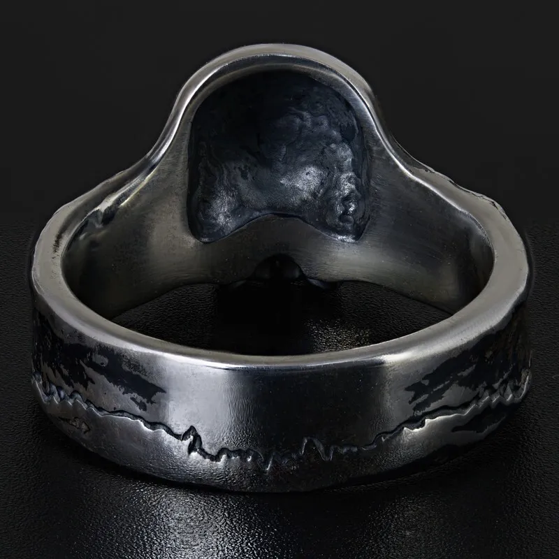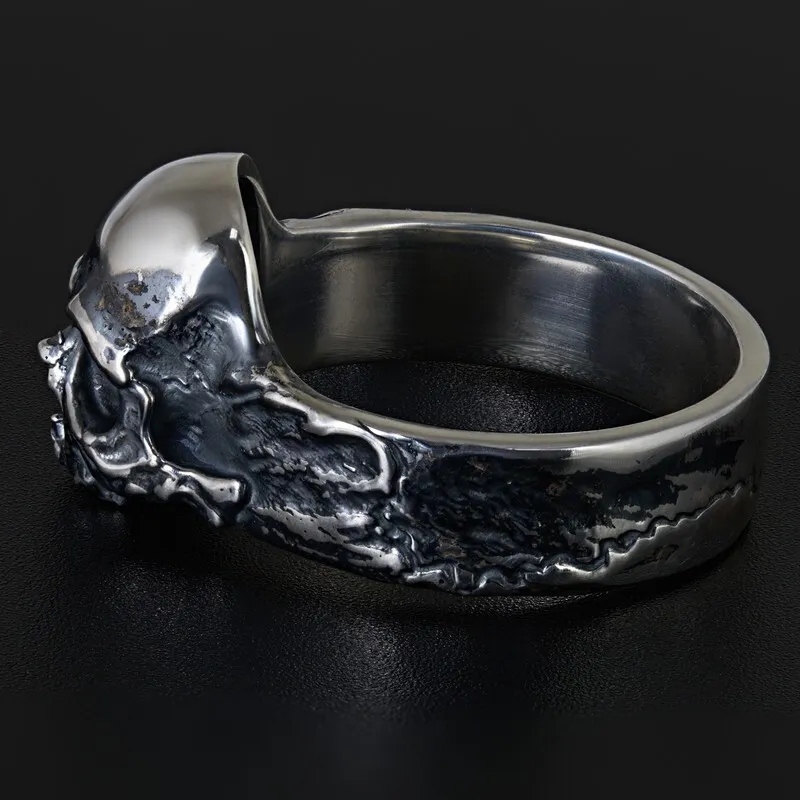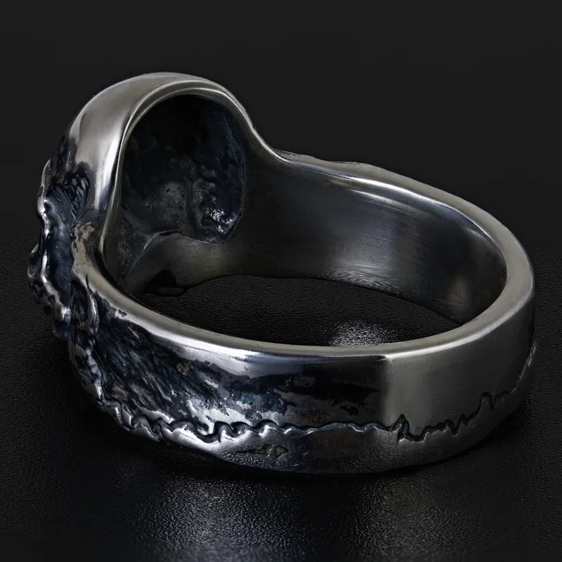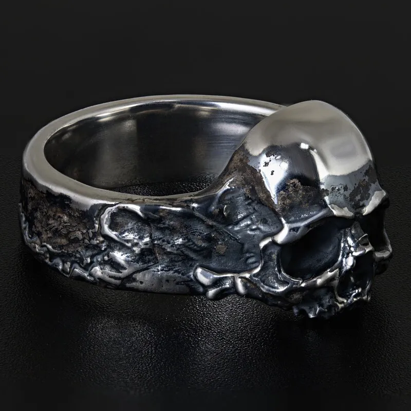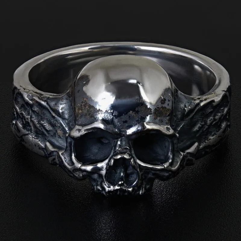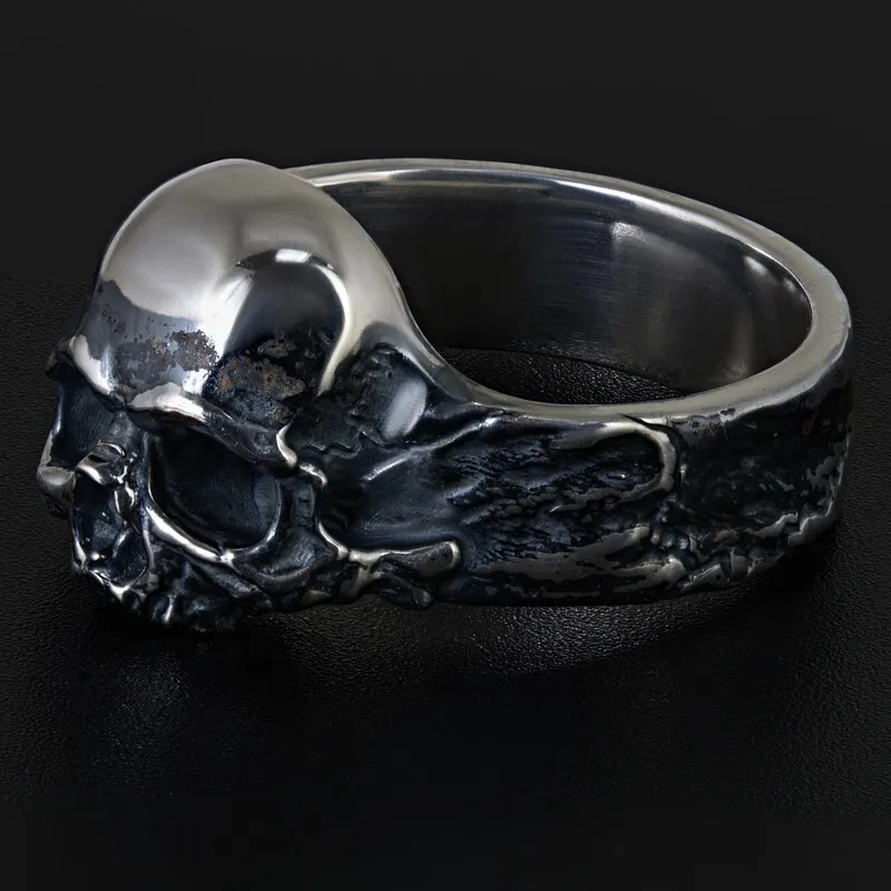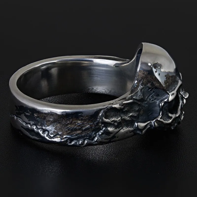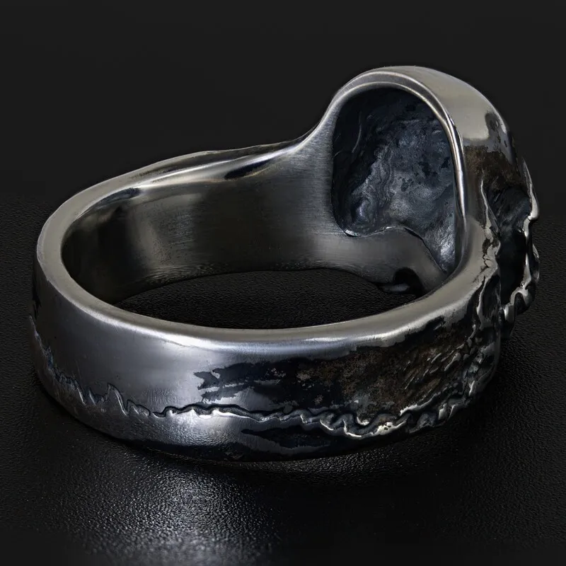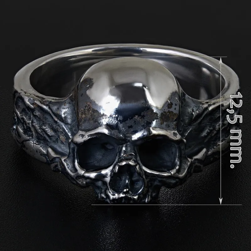 Серебряное мужское кольцо с черепом без рогов. Поверхность зачерненная и отполированная. Размер лицевой части: 12.5 мм. Средний вес изделия 8.77 гр. Все изделия собственного производства. Арт. 8099 Знак черепа широко распространен во многих культурах, чаще всего он является символом бессмертия и пути спасения. У кельтов это был знаком защищающим от злых сил, дарующий здоровье и успех. Символом защиты от смерти является для тех чей образ жизни связан с риском. В Русской Императорской армии символика черепа впервые использовалась в Отечественной войне 1812 года. Конный полк Петербургского ополчения назывался «Смертоносным» или «Бессмертным» полком. У чинов этой части головные уборы были украшены серебряными черепами.