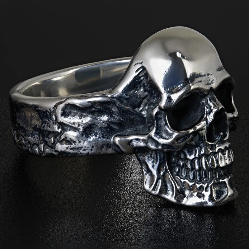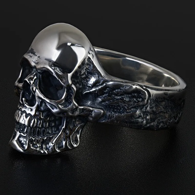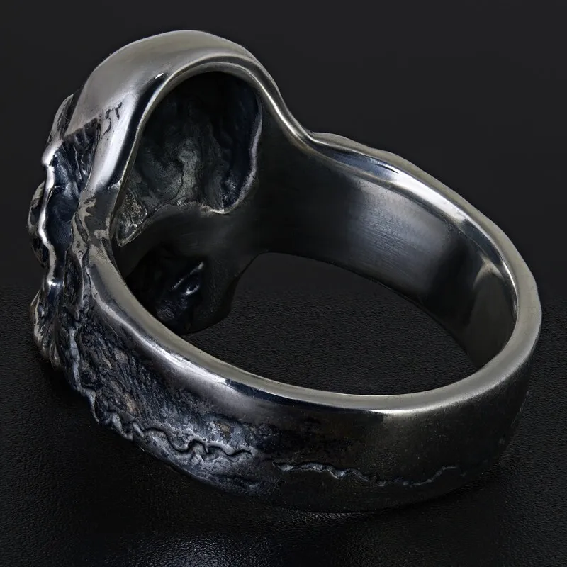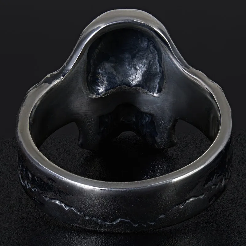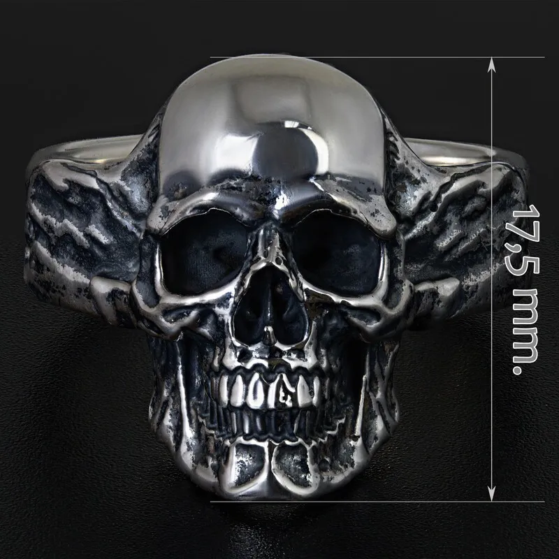 Серебряное мужское кольцо с черепом без рогов. Поверхность зачерненная и отполированная. Размер лицевой части: 17.5 мм. Средний вес изделия 9.91 гр. Все изделия собственного производства, гарантия 12 месяцев. Арт. 8100 Знак черепа широко распространен во многих культурах, чаще всего он является символом бессмертия и пути спасения. У кельтов это был знаком защищающим от злых сил, дарующий здоровье и успех. Символом защиты от смерти является для тех чей образ жизни связан с риском. В Русской Императорской армии символика черепа впервые использовалась в Отечественной войне 1812 года. Конный полк Петербургского ополчения назывался «Смертоносным» или «Бессмертным» полком. У чинов этой части головные уборы были украшены серебряными черепами.
