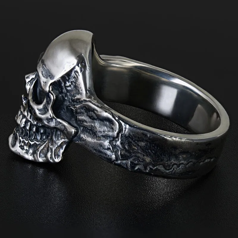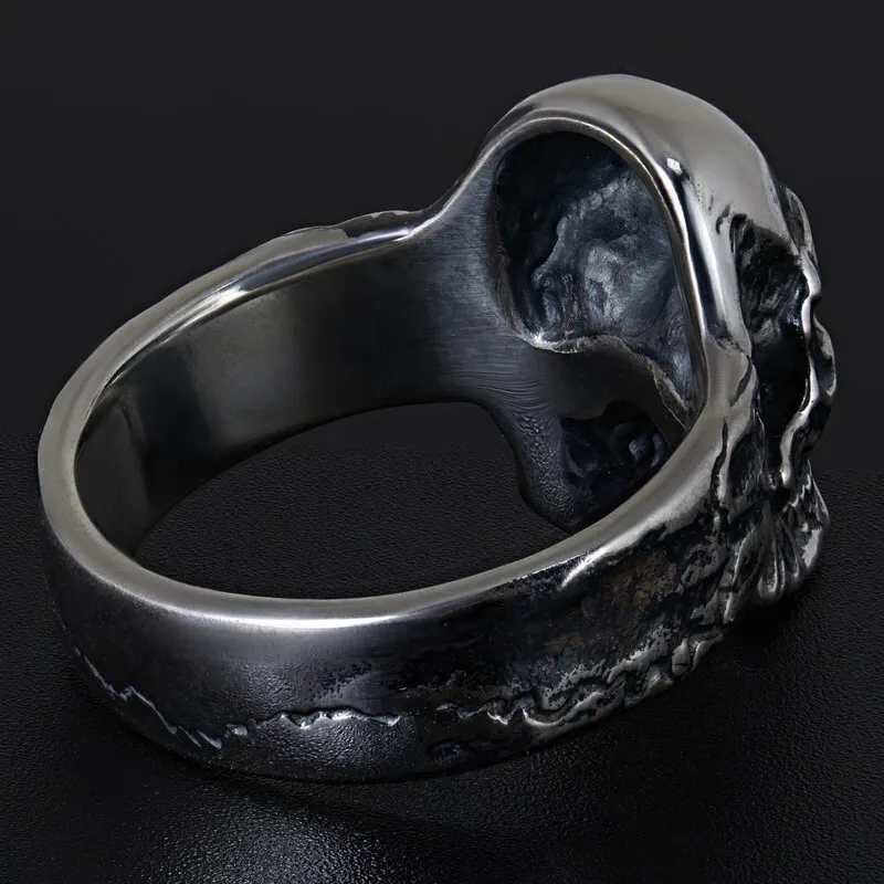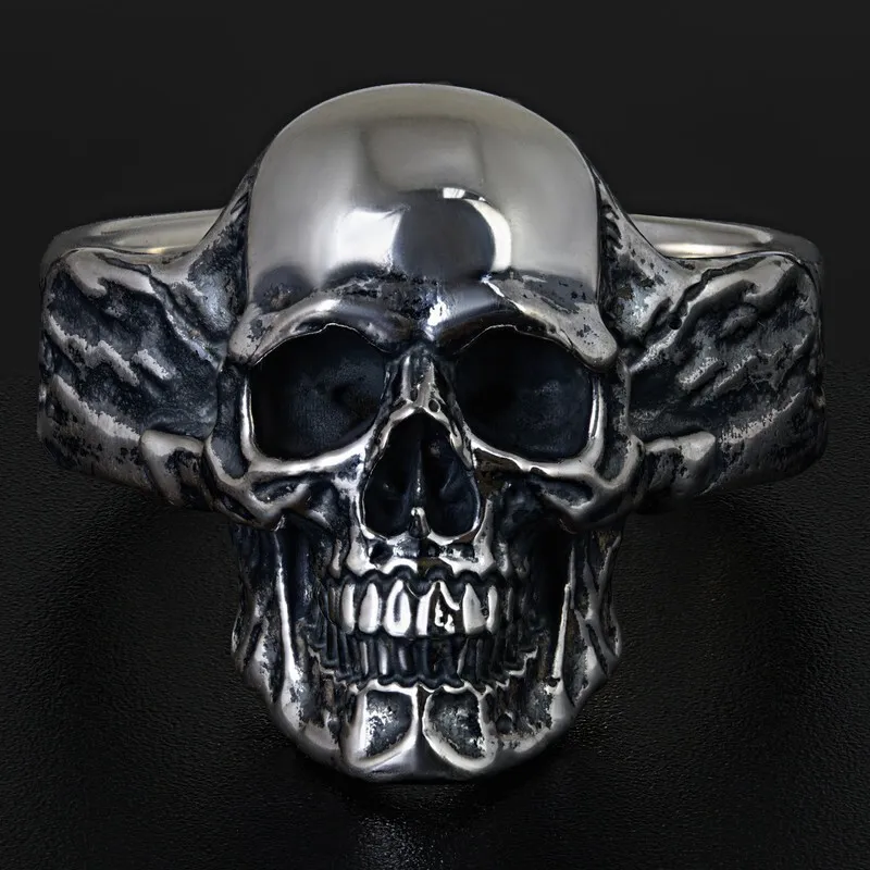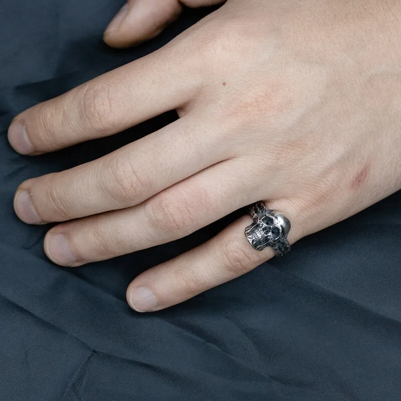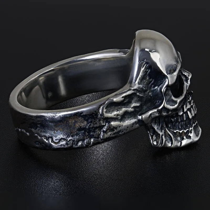 Серебряное мужское кольцо с черепом без рогов. Поверхность зачерненная и отполированная. Размер лицевой части: 17.5 мм. Средний вес изделия 9.91 гр. Все изделия собственного производства, гарантия 12 месяцев. Арт. 8100 Знак черепа широко распространен во многих культурах, чаще всего он является символом бессмертия и пути спасения. У кельтов это был знаком защищающим от злых сил, дарующий здоровье и успех. Символом защиты от смерти является для тех чей образ жизни связан с риском. В Русской Императорской армии символика черепа впервые использовалась в Отечественной войне 1812 года. Конный полк Петербургского ополчения назывался «Смертоносным» или «Бессмертным» полком. У чинов этой части головные уборы были украшены серебряными черепами.