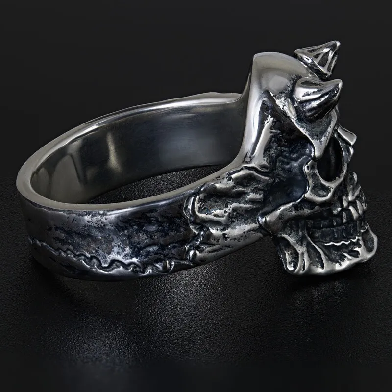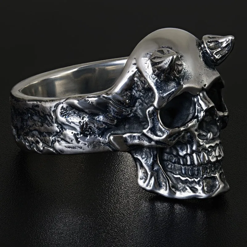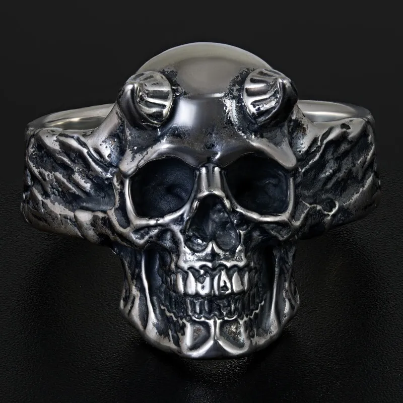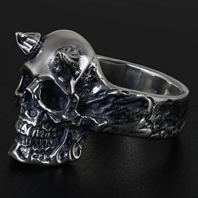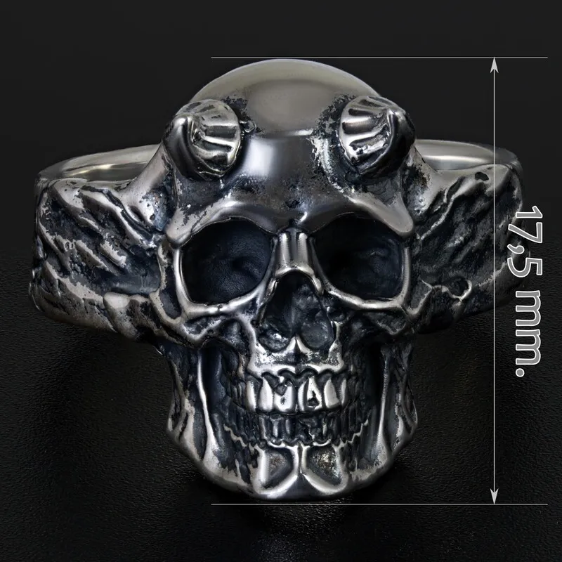 Серебряное мужское кольцо с черепом с рогами. Поверхность зачерненная и отполированная. Размер лицевой части: 17.5 мм. Средний вес изделия 10.06 гр. Все изделия собственного производства, гарантия 12 месяцев. Арт. 8102 Знак черепа широко распространен во многих культурах, чаще всего он является символом бессмертия и пути спасения. У кельтов это был знаком защищающим от злых сил, дарующий здоровье и успех. Символом защиты от смерти является для тех чей образ жизни связан с риском. В Русской Императорской армии символика черепа впервые использовалась в Отечественной войне 1812 года. Конный полк Петербургского ополчения назывался «Смертоносным» или «Бессмертным» полком. У чинов этой части головные уборы были украшены серебряными черепами.