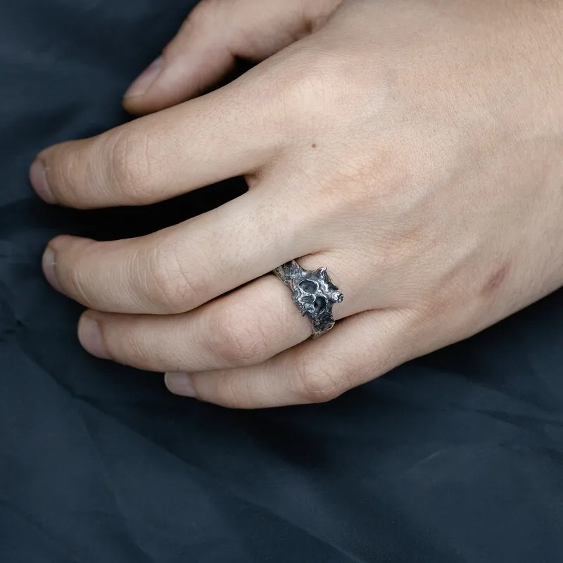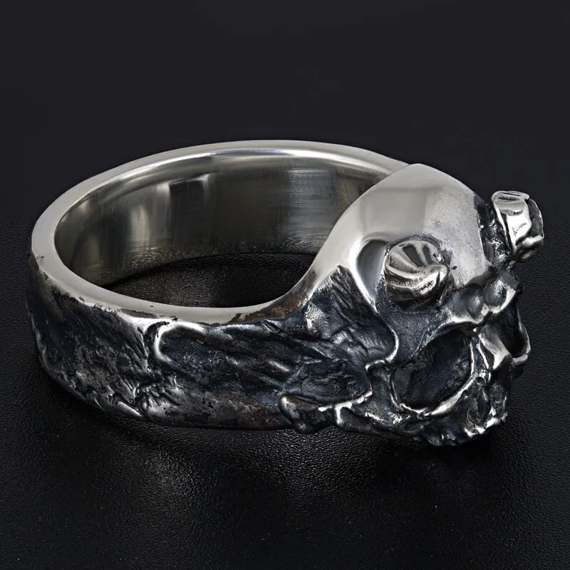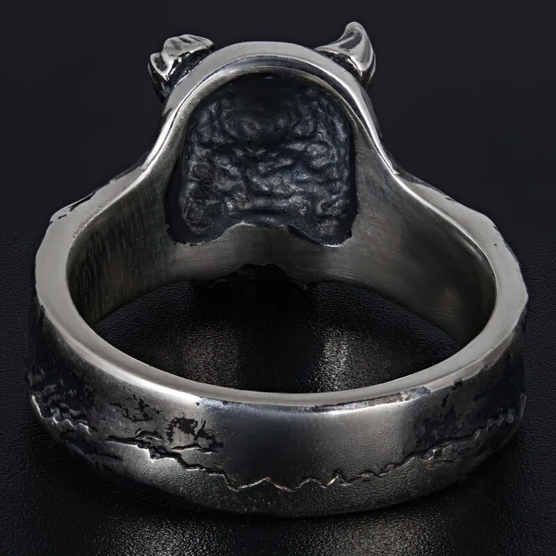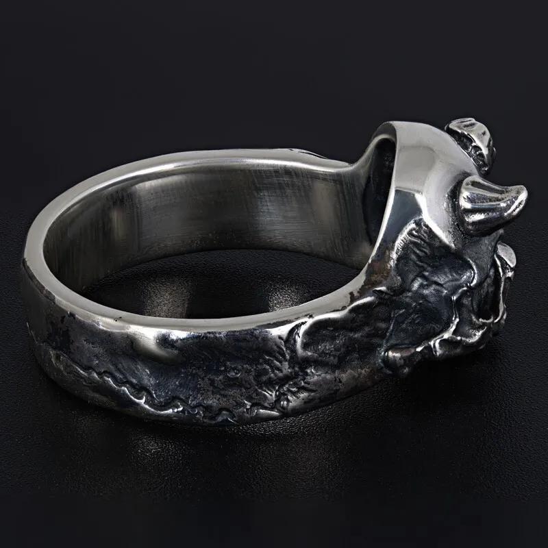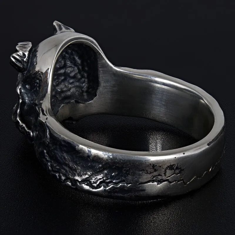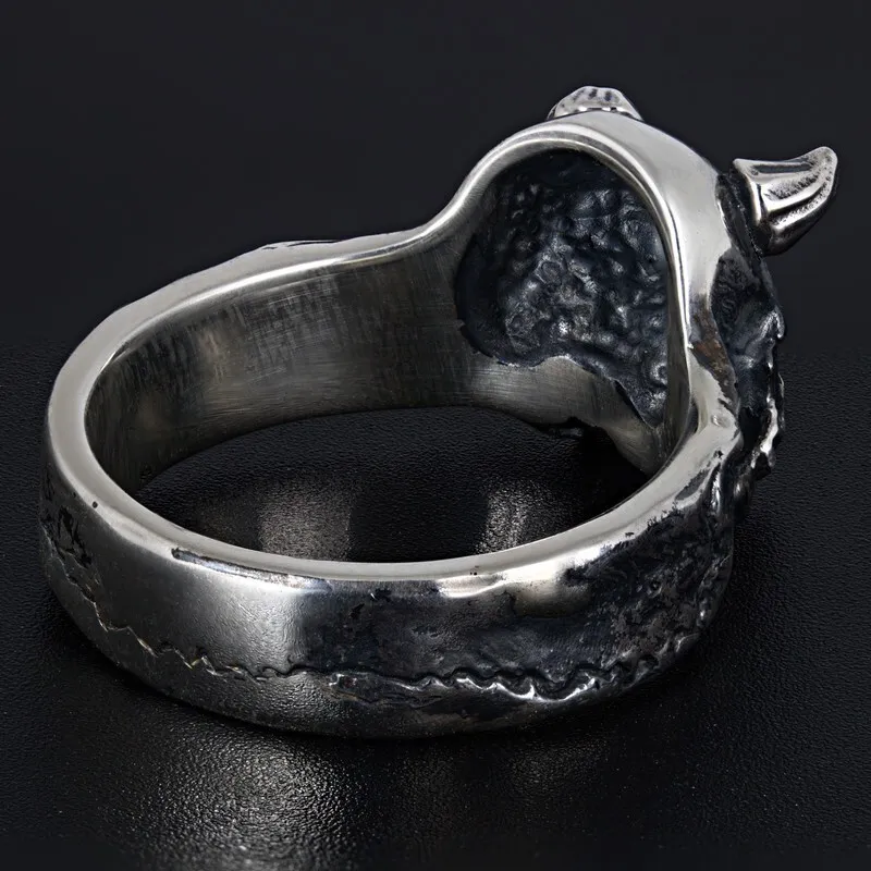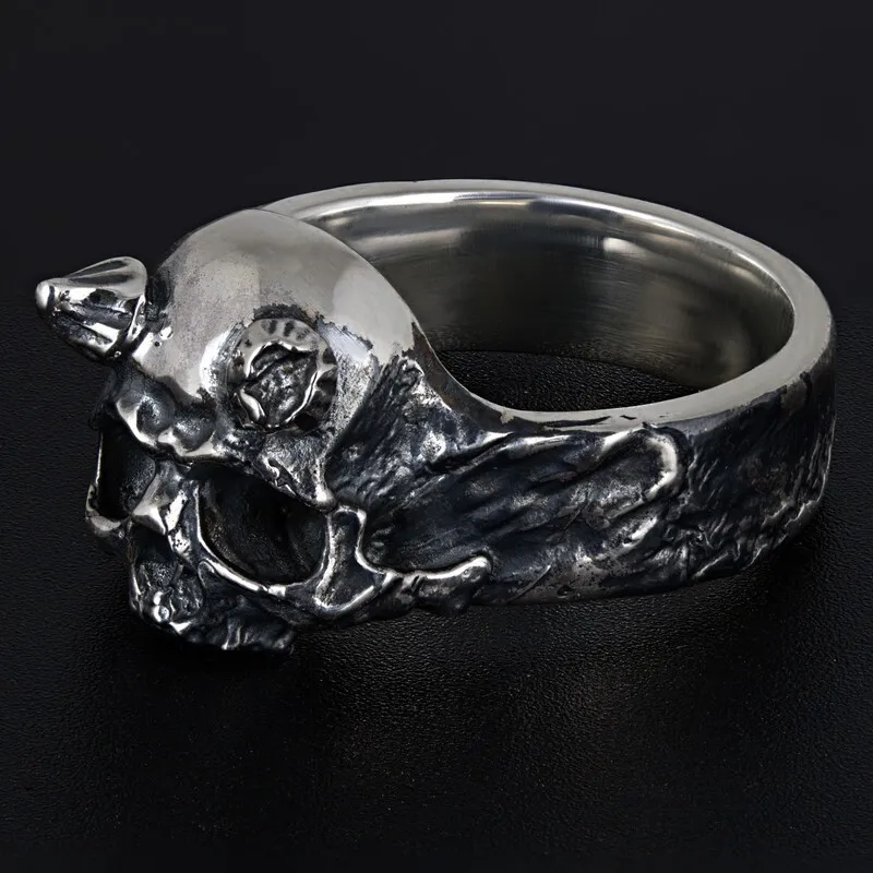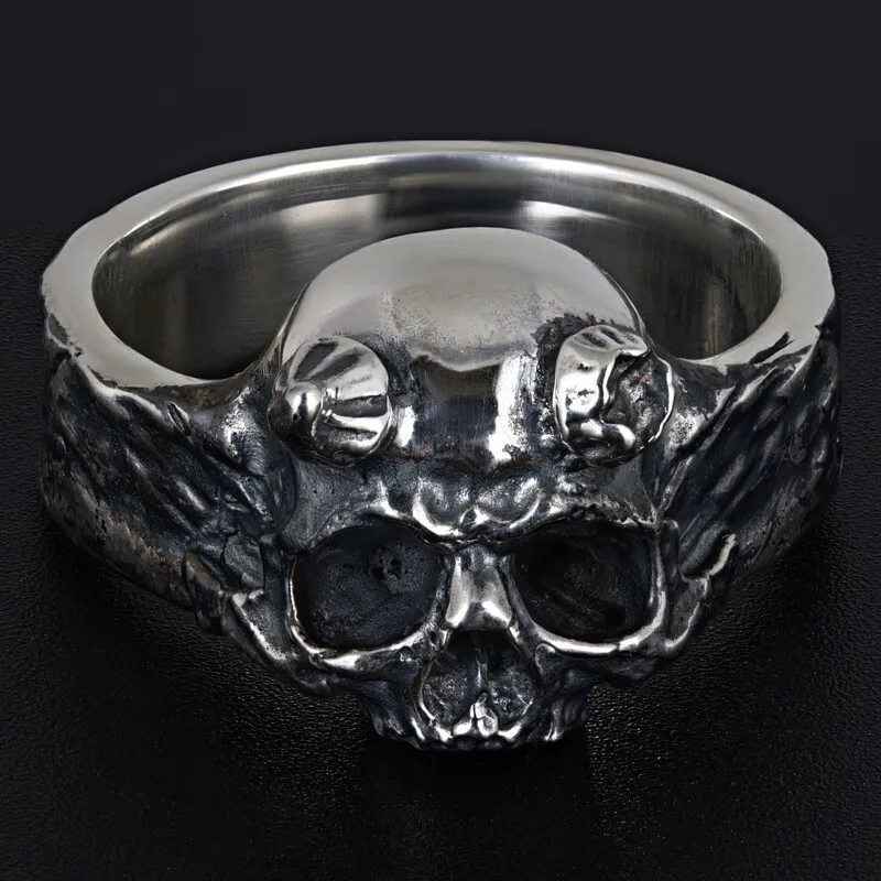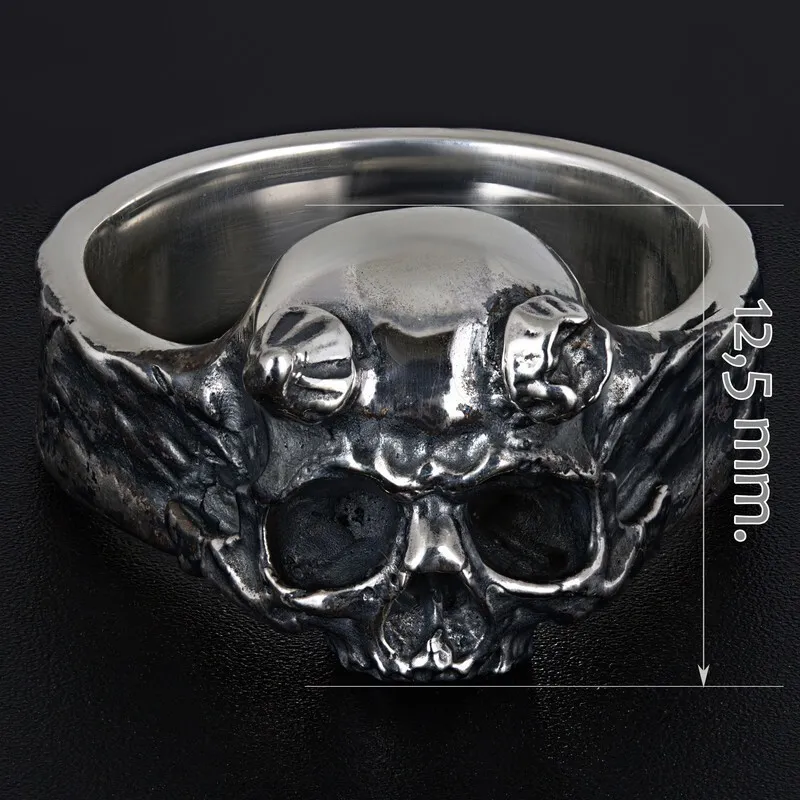 Серебряное мужское кольцо с черепом с рогами. Поверхность зачерненная и отполированная. Размер лицевой части: 12.5 мм. Средний вес изделия 9.08 гр. Все изделия собственного производства, гарантия 12 месяцев. Арт. 8103 Знак черепа широко распространен во многих культурах, чаще всего он является символом бессмертия и пути спасения. У кельтов это был знаком защищающим от злых сил, дарующий здоровье и успех. Символом защиты от смерти является для тех чей образ жизни связан с риском. В Русской Императорской армии символика черепа впервые использовалась в Отечественной войне 1812 года. Конный полк Петербургского ополчения назывался «Смертоносным» или «Бессмертным» полком. У чинов этой части головные уборы были украшены серебряными черепами.