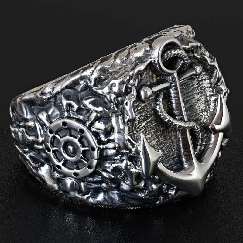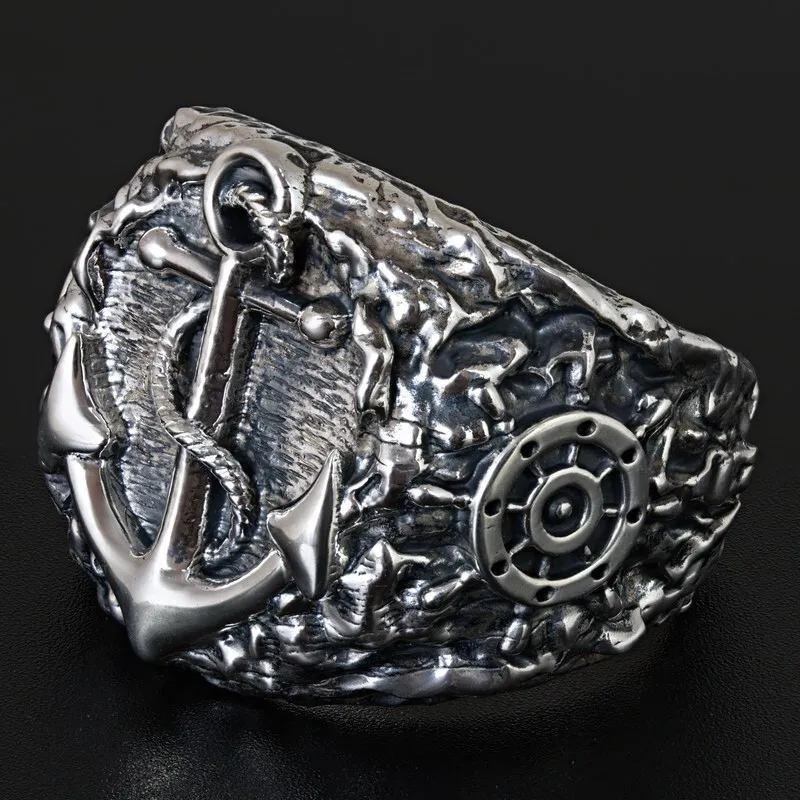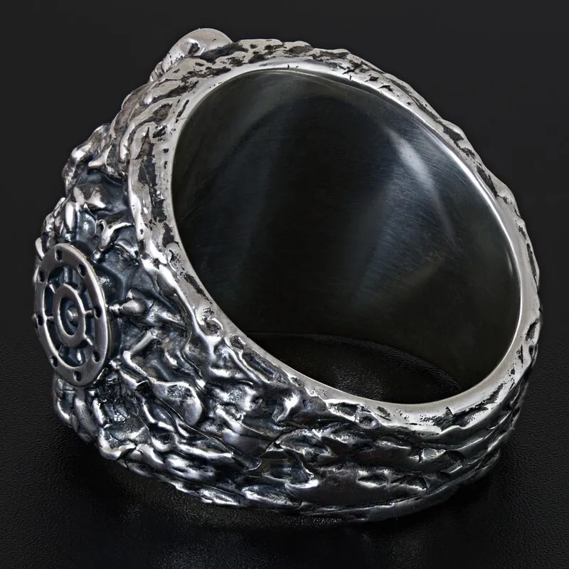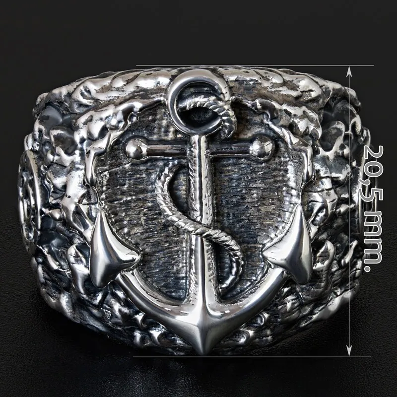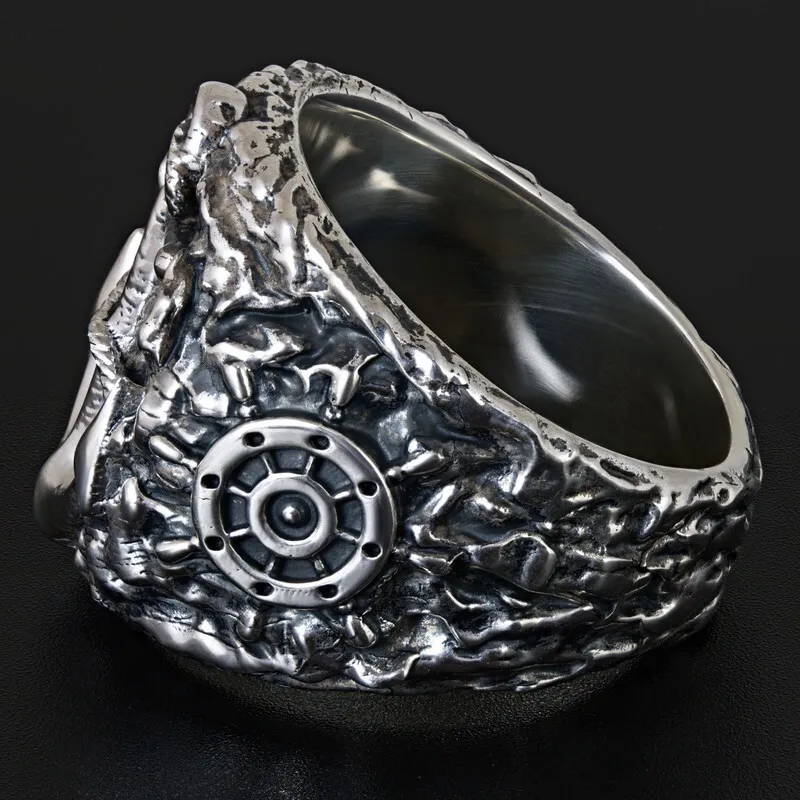Серебряное мужское кольцо с якорем и штурвалом. Поверхность зачерненная и отполированная. Размер лицевой части: 20.5 мм. Средний вес изделия 28.55 гр. Все изделия собственного производства, гарантия 12 месяцев. Арт. 8112