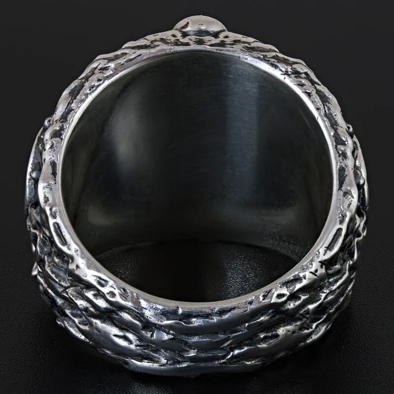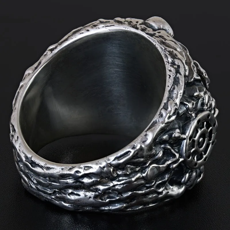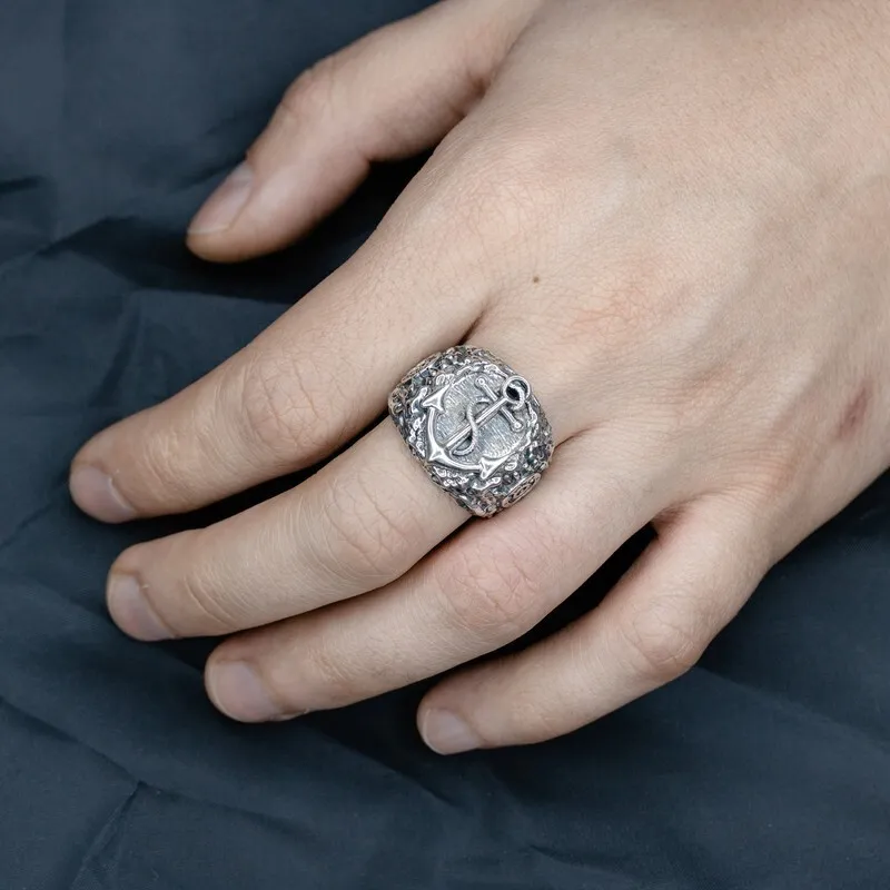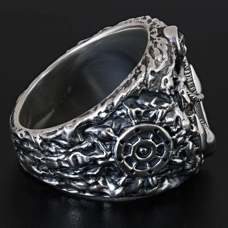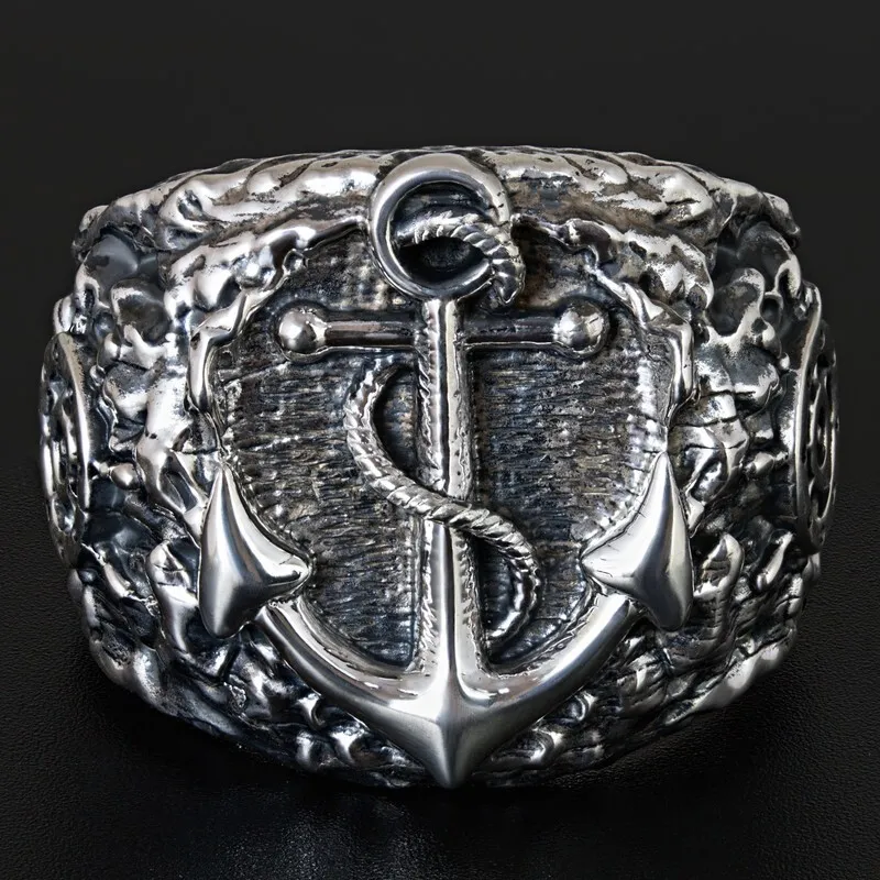 Серебряное мужское кольцо с якорем и штурвалом. Поверхность зачерненная и отполированная. Размер лицевой части: 20.5 мм. Средний вес изделия 28.55 гр. Все изделия собственного производства, гарантия 12 месяцев. Арт. 8112