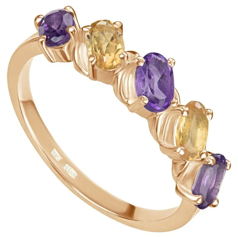 Серебряное кольцо с натуральными камнями аметист и цитрин - коллекция Колосок. Серебряное кольцо 925 пробы с покрытием розовое золото. Цвет покрытия соответствует швейцарскому цветовому стандарту NIHS -4N и цвету розового золота 585 в России. На последней фотографии мы разместили сравнительную фотографию 3 цвета золотого покрытия. Помимо предания золотого цвета Вашему изделию, тонкий слой золота защищает от окисления. Для более стойкого эффекта золочения и долговечности покрытия мы дополнительно наносим подслой палладия (Pd). Средний вес изделия с камнями 2.2 гр. Месторождения: Аметист (Приполярный Урал, Россия) и Цитрин (Урал, Россия) Аметист (Натуральный) овал 3*5 мм., средний вес: 0.26 карат. Цитрин (Натуральный) овал 3*5 мм., средний вес: 0.24 карат. Все изделия собственного производства, гарантия 12 месяцев. Арт. 8035