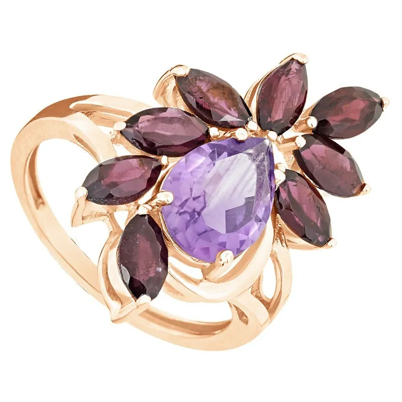 Серебряное кольцо "Элегия" с натуральными камнями аметист и гранат, покрытие Красное Золото. Средний вес украшения с камнями 3,43 гр.