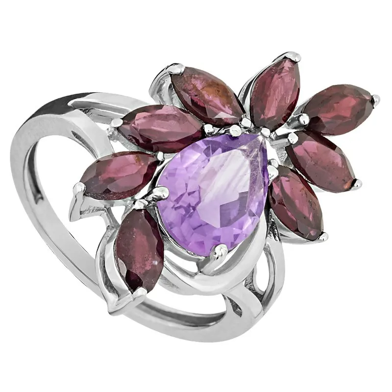 Серебряное кольцо "Элегия" с натуральными камнями аметист и гранат, покрытие Белый Родий. Средний вес украшения с камнями 3,43 гр.