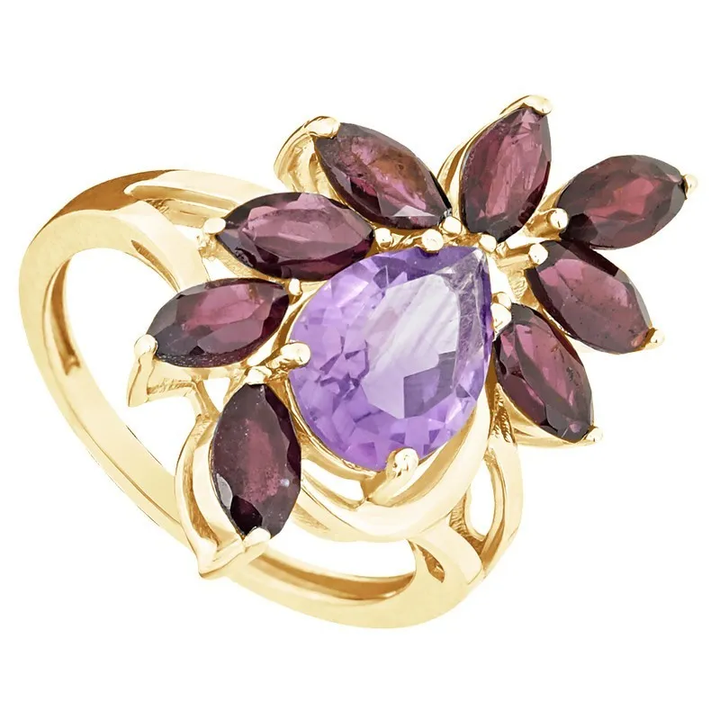 Серебряное кольцо "Элегия" с натуральными камнями аметист и гранат, покрытие Желтое Золото. Средний вес украшения с камнями 3,43 гр.