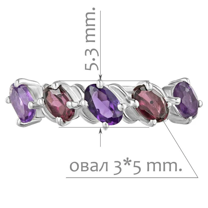 Серебряное кольцо с натуральными камнями аметист и гранат - коллекция Колосок. Средний вес изделия с камнями 2.31 гр. Месторождения: Аметист (Приполярный Урал, Россия) и Гранат (Кольский п-ов, Россия) Аметист (Натуральный) овал 3*5 мм., средний вес: 0.26 карат. Гранат (Натуральный) овал 3*5 мм., средний вес: 0.34 карат. Все изделия собственного производства, гарантия 12 месяцев. Арт. 8039