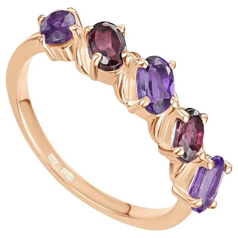 Серебряное кольцо с натуральными камнями аметист и гранат - коллекция Колосок. Серебряное кольцо 925 пробы с покрытием красное золото. Цвет покрытия соответствует швейцарскому цветовому стандарту NIHS -5N и цвету красного золота 585 в России. На последней фотографии мы разместили сравнительную фотографию 3 цвета золотого покрытия. Помимо предания золотого цвета Вашему изделию, тонкий слой золота защищает от окисления. Для более стойкого эффекта золочения и долговечности покрытия мы дополнительно наносим подслой палладия (Pd). Средний вес изделия с камнями 2.31 гр. Месторождения: Аметист (Приполярный Урал, Россия) и Гранат (Кольский п-ов, Россия) Аметист (Натуральный) овал 3*5 мм., средний вес: 0.26 карат. Гранат (Натуральный) овал 3*5 мм., средний вес: 0.34 карат. Все изделия собственного производства, гарантия 12 месяцев. Арт. 8039