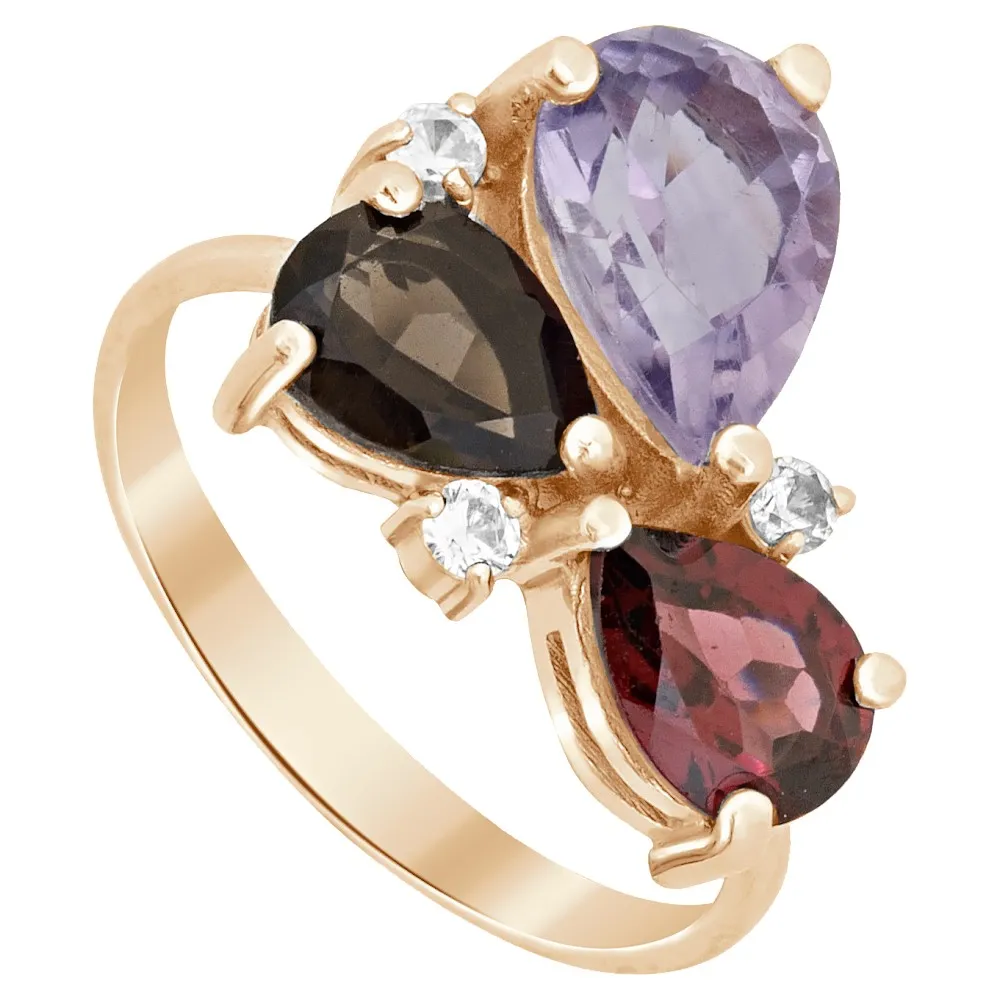 Серебряное кольцо "Капель" с натуральными камнями аметист (светлый), гранат и раухтопаз, покрытие Розовое Золото. Средний вес украшения с камнями 3,05 гр. Месторождение(я) камней: Аметист (Приполярный Урал, Россия), Гранат (Кольский п-ов, Россия), Раухтопаз (Дымчатый кварц) (м-ние Додо ХМАО, Россия). Аметист (Натуральный) груша: 6*9 мм., средний вес 1,00 карат. Раухтопаз (Натуральный) груша: 5*7 мм., средний вес 0,70 карат. Гранат (Натуральный) груша: 5*7 мм., средний вес 0,75 карат. Циркон белый (Натуральный) круг: 2 мм., средний вес 0,05 карат.