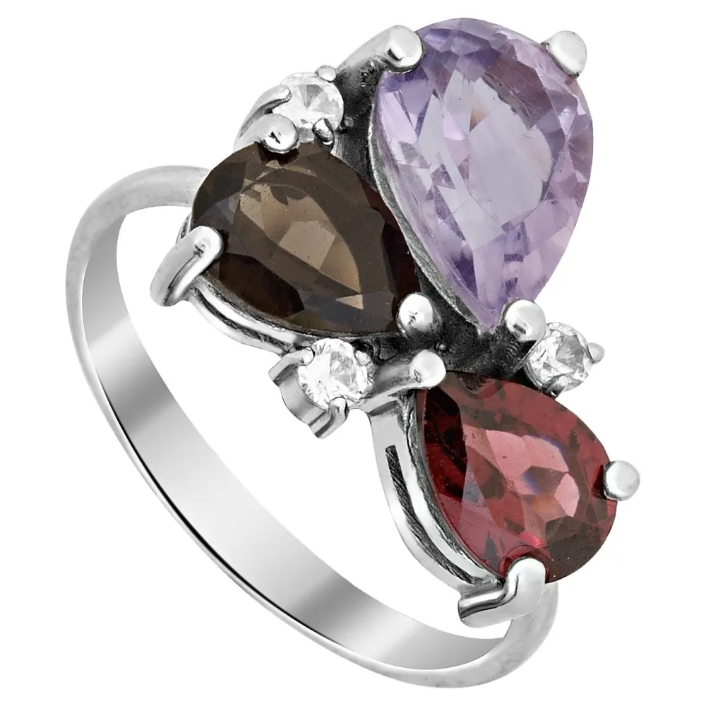 Серебряное кольцо "Капель" с натуральными камнями аметист (светлый), гранат и раухтопаз, покрытие Белый Родий. Средний вес украшения с камнями 3,05 гр. Месторождение(я) камней: Аметист (Приполярный Урал, Россия), Гранат (Кольский п-ов, Россия), Раухтопаз (Дымчатый кварц) (м-ние Додо ХМАО, Россия). Аметист (Натуральный) груша: 6*9 мм., средний вес 1,00 карат. Раухтопаз (Натуральный) груша: 5*7 мм., средний вес 0,70 карат. Гранат (Натуральный) груша: 5*7 мм., средний вес 0,75 карат. Циркон белый (Натуральный) круг: 2 мм., средний вес 0,05 карат.