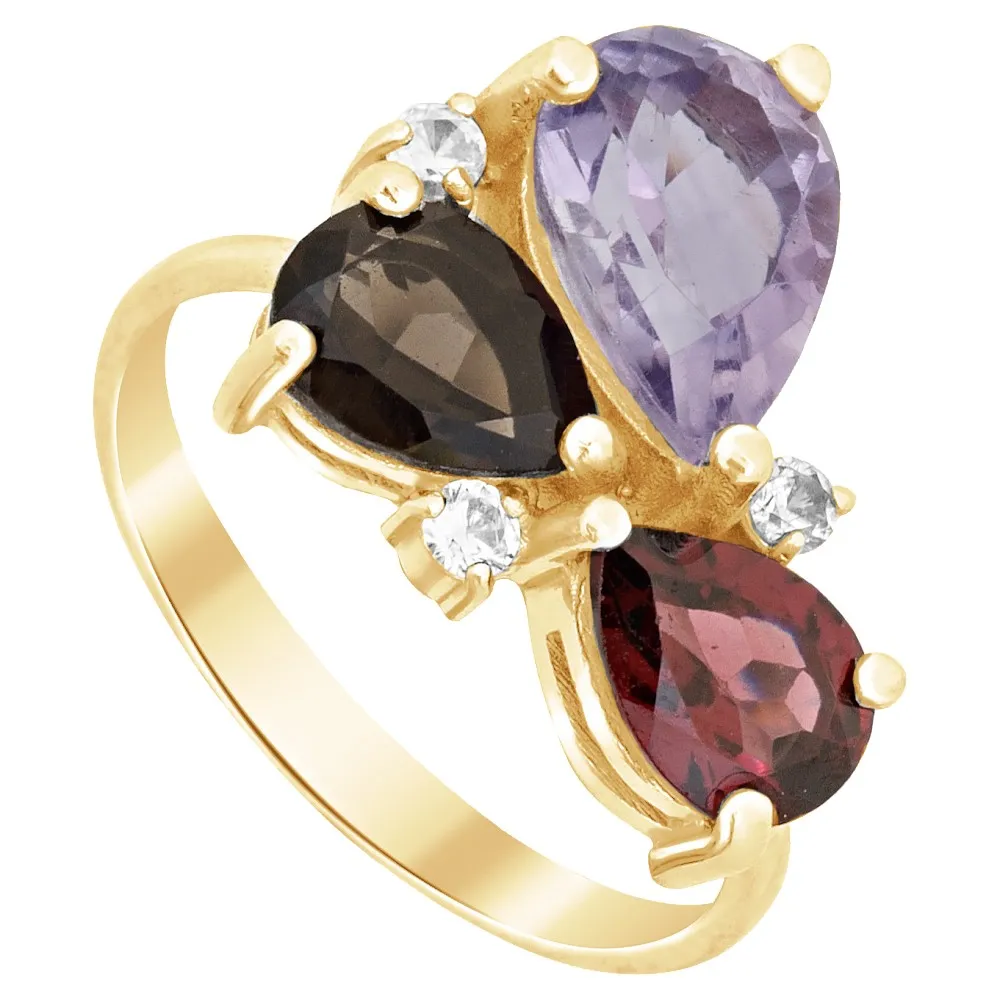 Серебряное кольцо "Капель" с натуральными камнями аметист (светлый), гранат и раухтопаз, покрытие Желтое Золото. Средний вес украшения с камнями 3,05 гр. Месторождение(я) камней: Аметист (Приполярный Урал, Россия), Гранат (Кольский п-ов, Россия), Раухтопаз (Дымчатый кварц) (м-ние Додо ХМАО, Россия). Аметист (Натуральный) груша: 6*9 мм., средний вес 1,00 карат. Раухтопаз (Натуральный) груша: 5*7 мм., средний вес 0,70 карат. Гранат (Натуральный) груша: 5*7 мм., средний вес 0,75 карат. Циркон белый (Натуральный) круг: 2 мм., средний вес 0,05 карат.