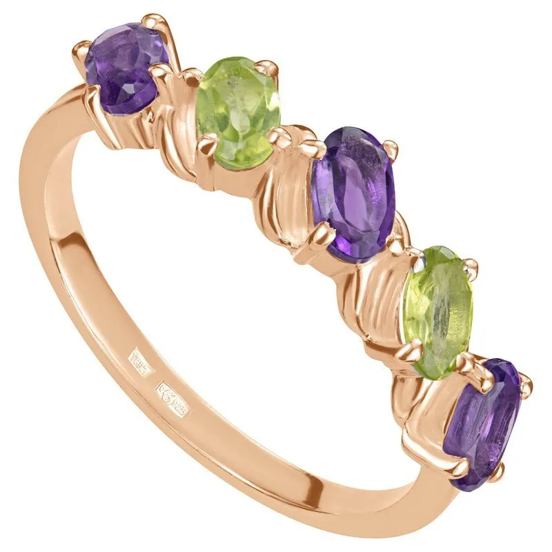 Серебряное кольцо с натуральными камнями аметист и хризолит - коллекция Колосок. Серебряное кольцо 925 пробы с покрытием красное золото. Цвет покрытия соответствует швейцарскому цветовому стандарту NIHS -5N и цвету красного золота 585 в России. На последней фотографии мы разместили сравнительную фотографию 3 цвета золотого покрытия. Помимо предания золотого цвета Вашему изделию, тонкий слой золота защищает от окисления. Для более стойкого эффекта золочения и долговечности покрытия мы дополнительно наносим подслой палладия (Pd). Средний вес изделия с камнями 2.18 гр. Месторождения: Аметист (Приполярный Урал, Россия) и Хризолит (Якутия, Россия) Аметист (Натуральный) овал 3*5 мм., средний вес: 0.26 карат. Хризолит (Натуральный) овал 3*5 мм., средний вес: 0.25 карат. Все изделия собственного производства, гарантия 12 месяцев. Арт. 8034