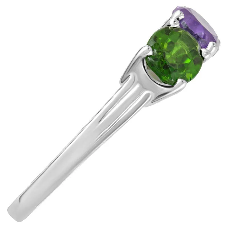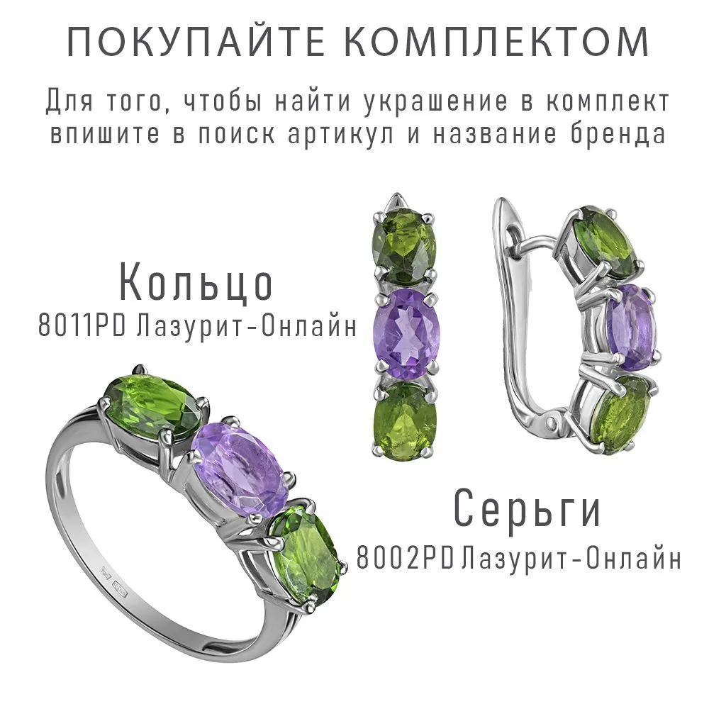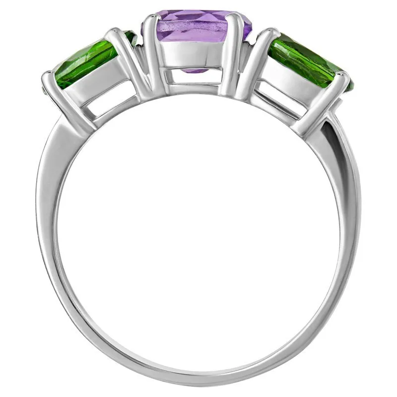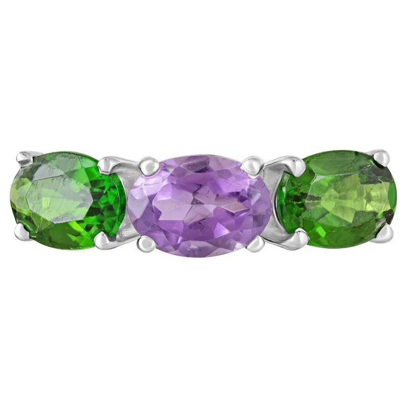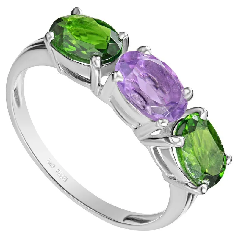 Серебряное кольцо с натуральными камнями аметист и хромдиопсид - коллекция Муза. Средний вес изделия с камнями 2.46гр. Месторождение(я): Аметист (Приполярный Урал, Россия) и Хромдиопсид (Якутия, Россия). Аметист (Натуральный) овал 5*7 мм., средний вес: 0.81 карат. Хромдиопсид (Натуральный) овал 5*7 мм., средний вес: 0.77 карат. Все изделия собственного производства, гарантия 12 месяцев. Арт. 8011