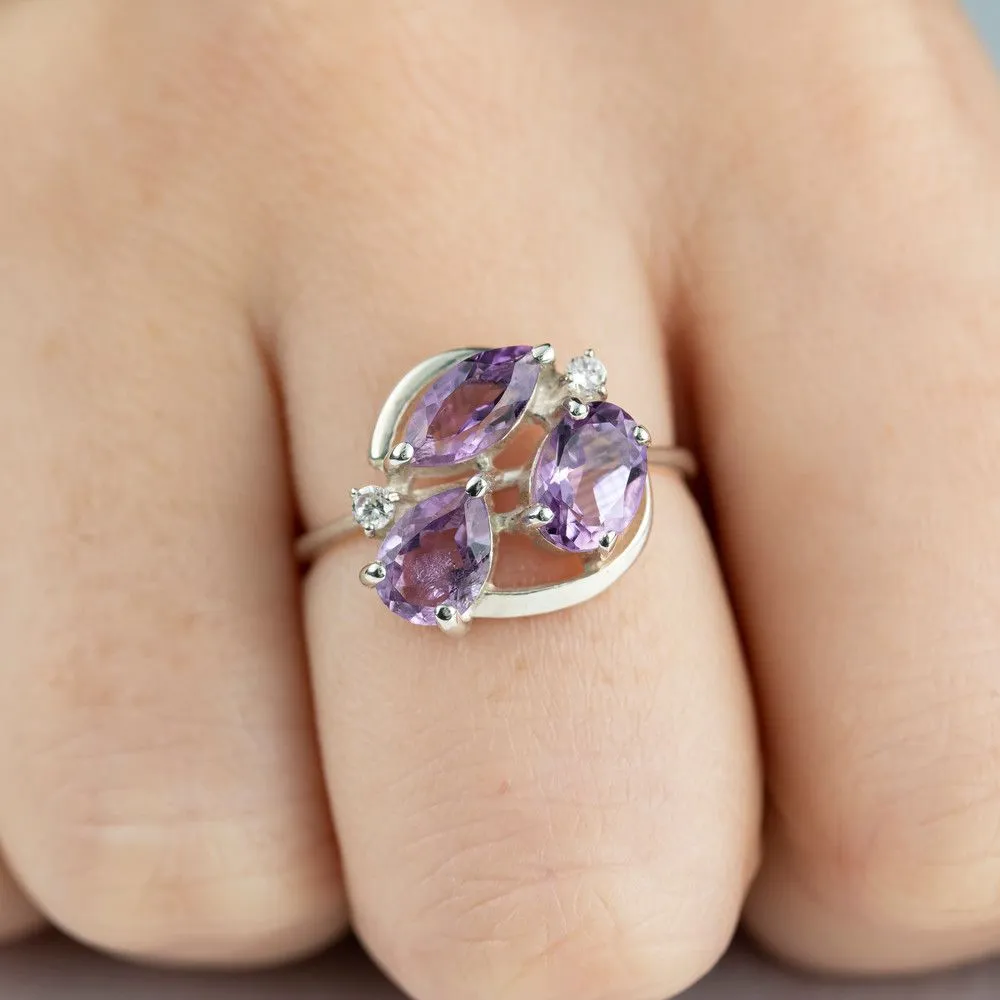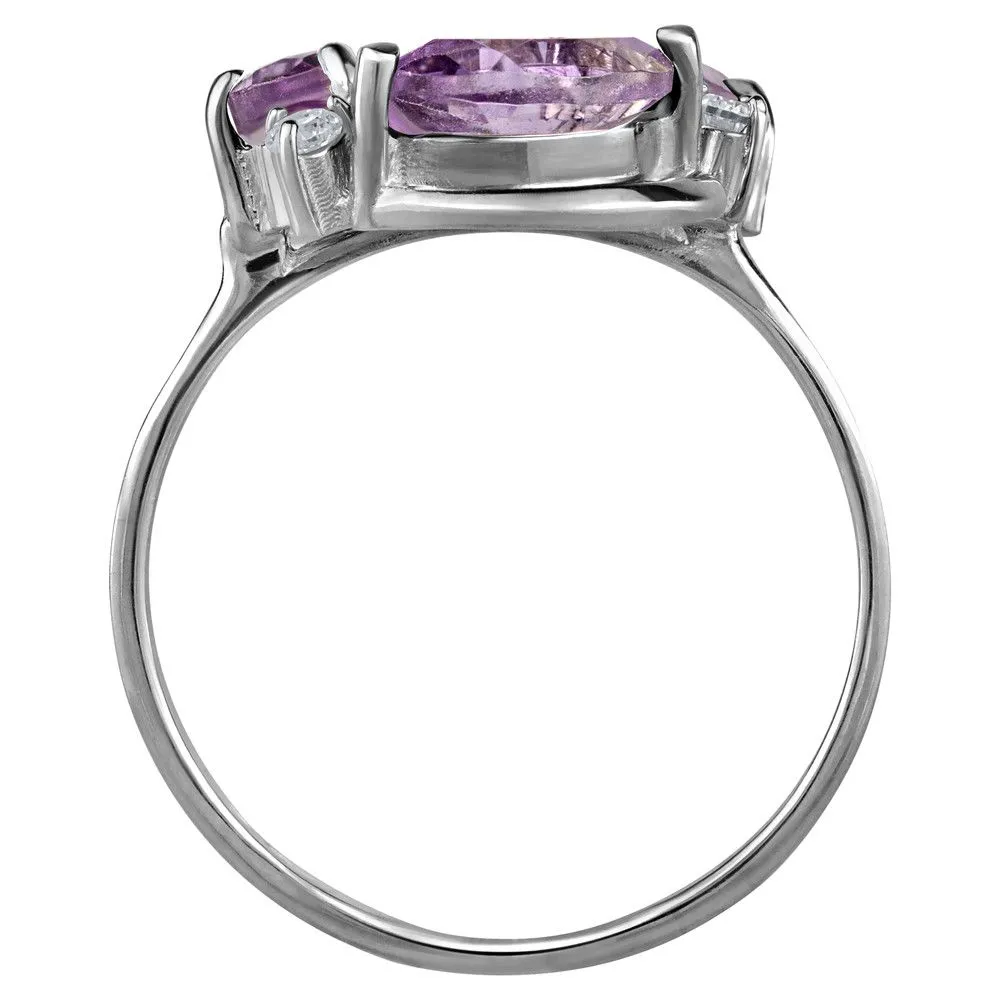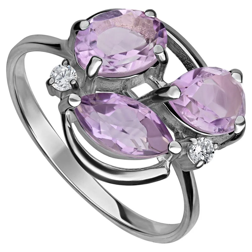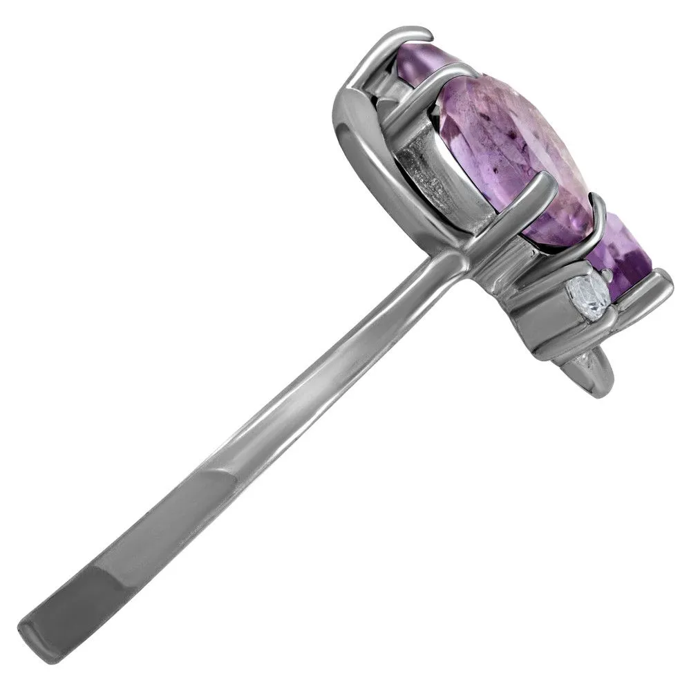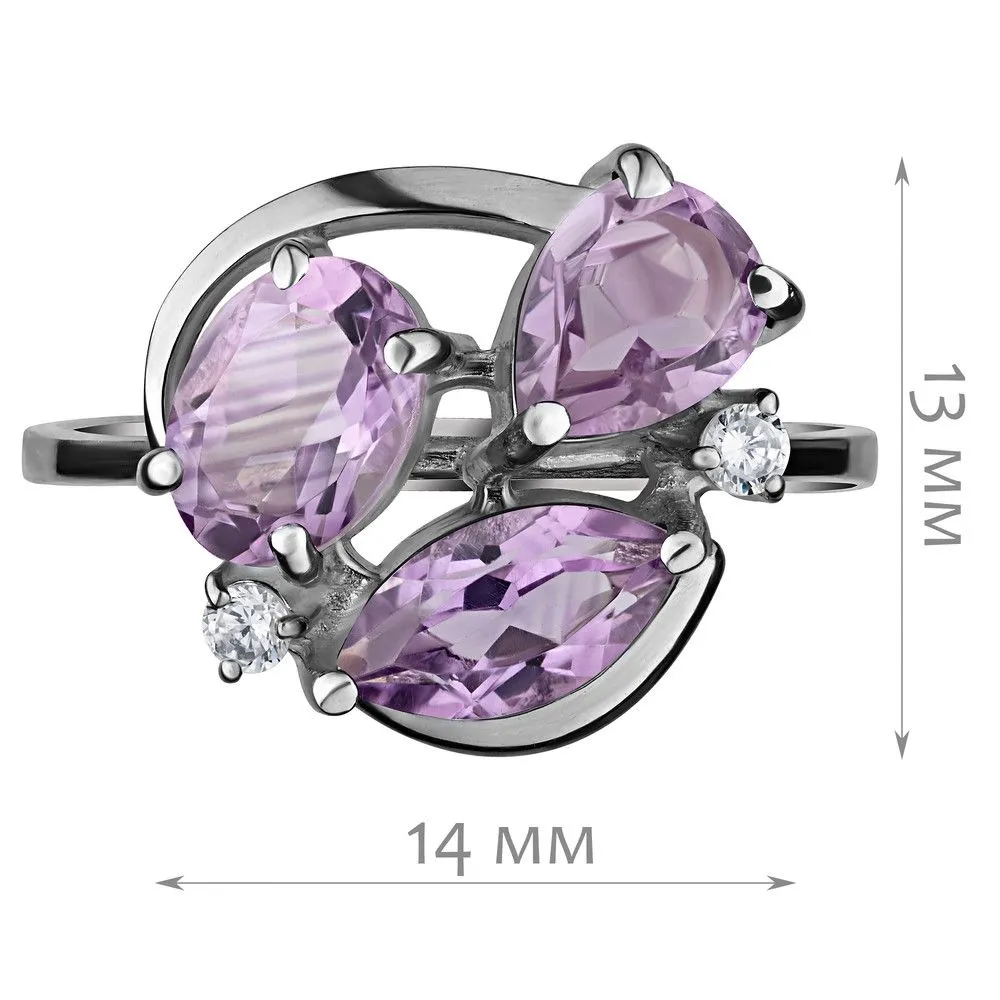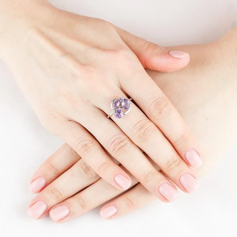 Серебряное кольцо "Фортуна" с натуральным аметистом, покрытие Палладий. Средний вес украшения с камнями 3,16 гр. Месторождение(я) камней: Аметист (Приполярный Урал, Россия). Аметист (Натуральный) маркиз: 4*8 мм., средний вес 0,50 карат. Аметист (Натуральный) овал: 5*7 мм., средний вес 0,80 карат. Аметист (Натуральный) груша: 5*7 мм., средний вес 0,70 карат. Циркон белый (Натуральный) круг: 2 мм., средний вес 0,05 карат. Размер лицевой части: 13*15 мм. Все изделия собственного производства и имеют гарантию 12 месяцев. Арт. 6613PD. Аметист — прозрачный или полупрозрачный камень фиолетовых оттенков, подвид кварца. Он гармонизирует разум, снимает стресс, улучшает кровообращение, способствует умственному развитию и личностному росту. Считается, что он также оберегает от головной боли и бессонницы, служит противоядием, помогает избавиться от алкоголизма и наделяет владельца проницательностью, раскрывая «третий глаз» (за который отвечает чакра аджна). В медитации помогает расслабиться и успокоиться. Положенный под подушку, аметист приносит хорошие сны.