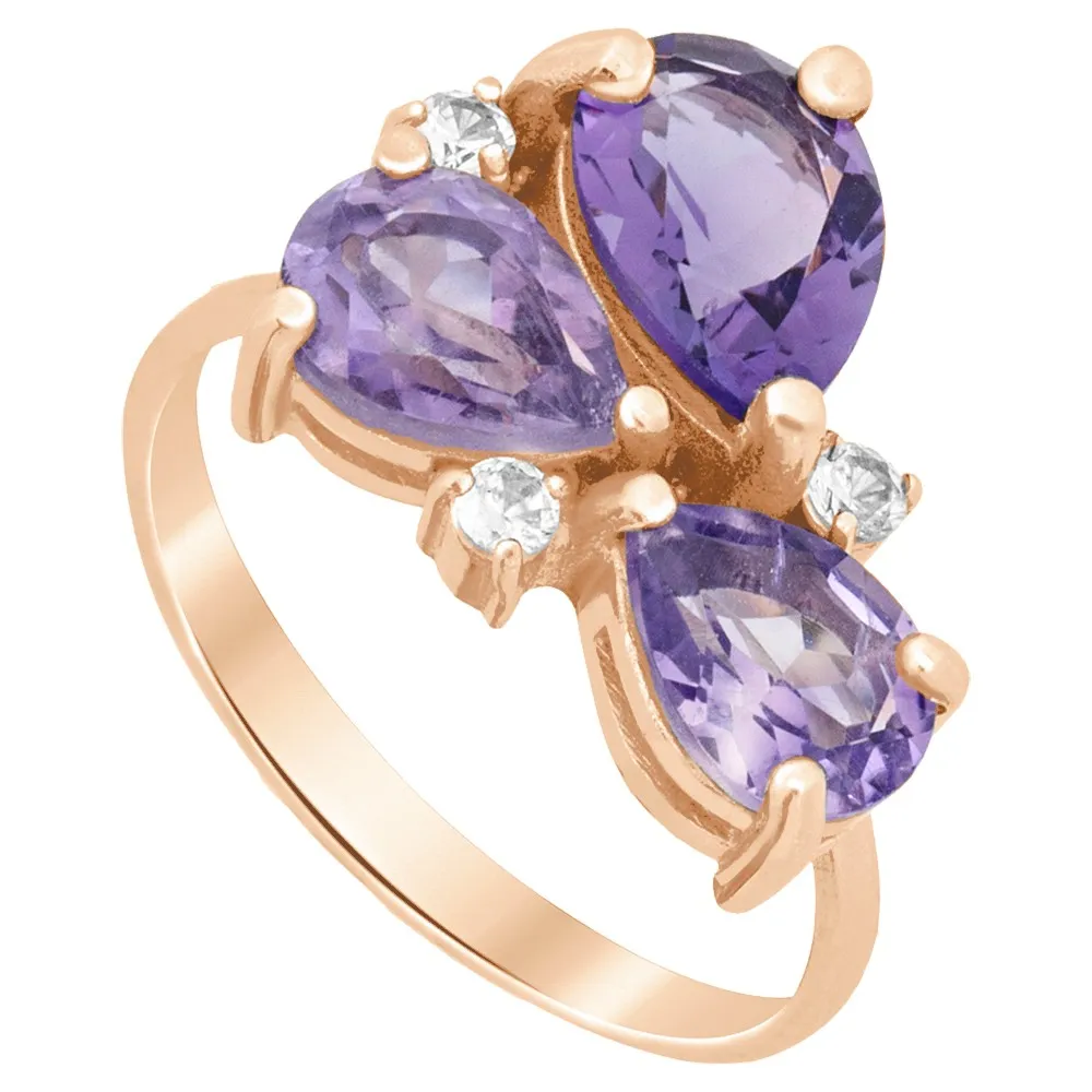 Серебряное кольцо "Капель" с натуральным аметистом, покрытие Красное Золото. Средний вес украшения с камнями 3,05 гр. Месторождение(я) камней: Аметист (Приполярный Урал, Россия). Аметист (Натуральный) груша: 6*9 мм., средний вес 1,00 карат. Аметист (Натуральный) груша: 5*7 мм., средний вес 0,80 карат. Циркон белый (Натуральный) круг: 2 мм., средний вес 0,05 карат.