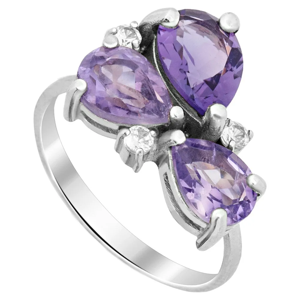 Серебряное кольцо "Капель" с натуральным аметистом, покрытие Белый Родий. Средний вес украшения с камнями 3,05 гр. Месторождение(я) камней: Аметист (Приполярный Урал, Россия). Аметист (Натуральный) груша: 6*9 мм., средний вес 1,00 карат. Аметист (Натуральный) груша: 5*7 мм., средний вес 0,80 карат. Циркон белый (Натуральный) круг: 2 мм., средний вес 0,05 карат.