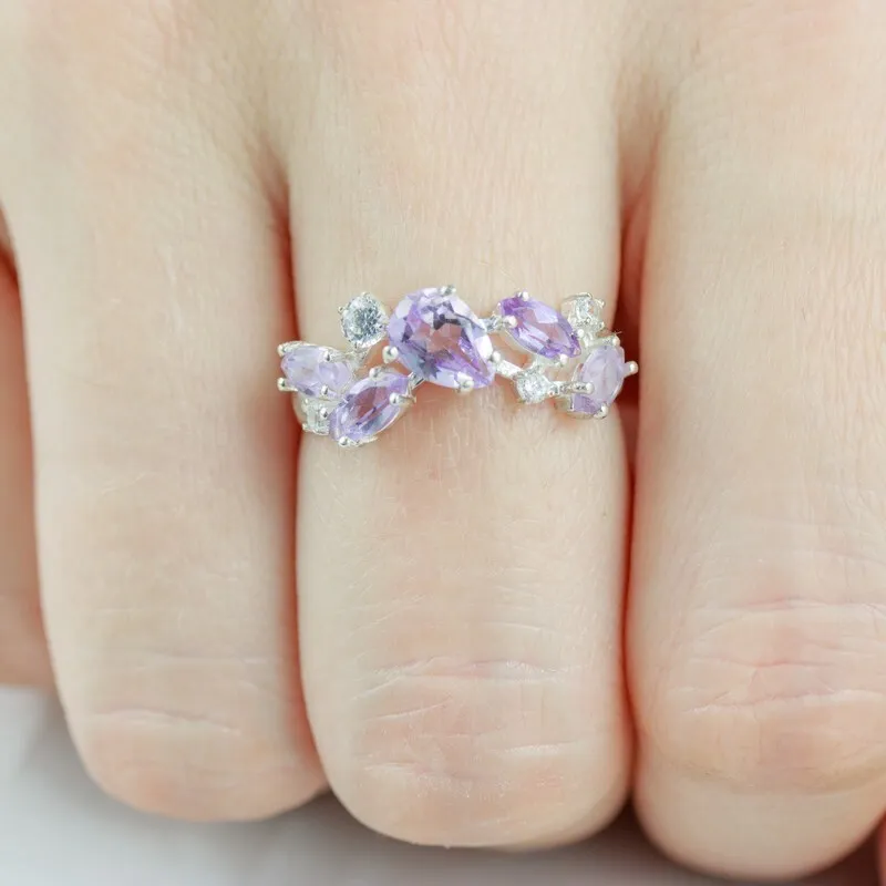 Серебряное кольцо с натуральным аметистом - коллекция Росинка. Средний вес изделия с камнями 2.49 гр. Месторождение: Аметист (Приполярный Урал, Россия). Аметист (Натуральный) груша 5*7 мм., средний вес: 0.65 карат. Все изделия собственного производства, гарантия 12 месяцев. Арт. 8429. Аметист — прозрачный или полупрозрачный камень фиолетовых оттенков, подвид кварца. Он гармонизирует разум, снимает стресс, улучшает кровообращение, способствует умственному развитию и личностному росту. Считается, что он также оберегает от головной боли и бессонницы, служит противоядием, помогает избавиться от алкоголизма и наделяет владельца проницательностью, раскрывая «третий глаз» (за который отвечает чакра аджна). В медитации помогает расслабиться и успокоиться. Положенный под подушку, аметист приносит хорошие сны.