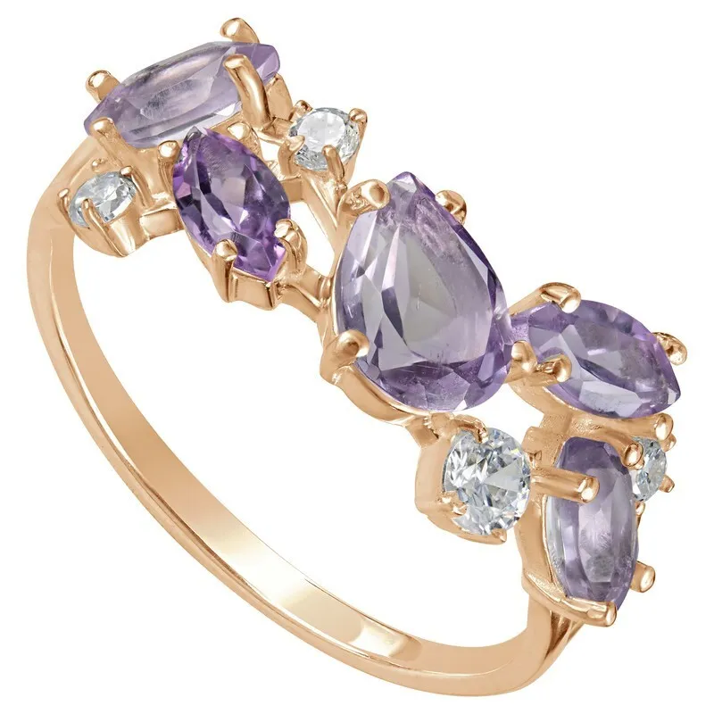 Серебряное кольцо с натуральным аметистом - коллекция Росинка. Серебряное кольцо 925 пробы с покрытием розовое золото. Цвет покрытия соответствует швейцарскому цветовому стандарту NIHS -4N и цвету розового золота 585 в России. На последней фотографии мы разместили сравнительную фотографию 3 цвета золотого покрытия. Помимо предания золотого цвета Вашему изделию, тонкий слой золота защищает от окисления. Для более стойкого эффекта золочения и долговечности покрытия мы дополнительно наносим подслой палладия (Pd). Средний вес изделия с камнями 2.49 гр. Месторождение: Аметист (Приполярный Урал, Россия). Аметист (Натуральный) груша 5*7 мм., средний вес: 0.65 карат. Все изделия собственного производства, гарантия 12 месяцев. Арт. 8429. Аметист — прозрачный или полупрозрачный камень фиолетовых оттенков, подвид кварца. Он гармонизирует разум, снимает стресс, улучшает кровообращение, способствует умственному развитию и личностному росту. Считается, что он также оберегает от головной боли и бессонницы, служит противоядием, помогает избавиться от алкоголизма и наделяет владельца проницательностью, раскрывая «третий глаз» (за который отвечает чакра аджна). В медитации помогает расслабиться и успокоиться. Положенный под подушку, аметист приносит хорошие сны.