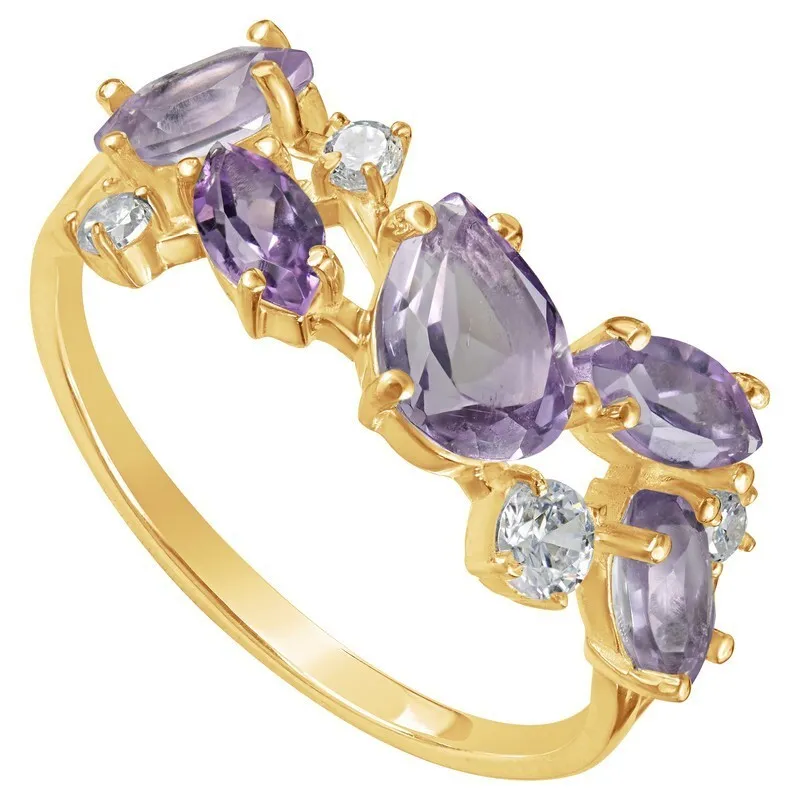 Серебряное кольцо с натуральным аметистом - коллекция Росинка. Серебряное кольцо 925 пробы с покрытием желтое золото. Цвет покрытия соответствует швейцарскому цветовому стандарту NIHS -FF24ct и цвету чистого золото 999.99. На последней фотографии мы разместили сравнительную фотографию 3 цвета золотого покрытия. Помимо предания золотого цвета Вашему изделию, тонкий слой золота защищает от окисления. Для более стойкого эффекта золочения и долговечности покрытия мы дополнительно наносим подслой палладия (Pd). Средний вес изделия с камнями 2.49 гр. Месторождение: Аметист (Приполярный Урал, Россия). Аметист (Натуральный) груша 5*7 мм., средний вес: 0.65 карат. Все изделия собственного производства, гарантия 12 месяцев. Арт. 8429. Аметист — прозрачный или полупрозрачный камень фиолетовых оттенков, подвид кварца. Он гармонизирует разум, снимает стресс, улучшает кровообращение, способствует умственному развитию и личностному росту. Считается, что он также оберегает от головной боли и бессонницы, служит противоядием, помогает избавиться от алкоголизма и наделяет владельца проницательностью, раскрывая «третий глаз» (за который отвечает чакра аджна). В медитации помогает расслабиться и успокоиться. Положенный под подушку, аметист приносит хорошие сны.