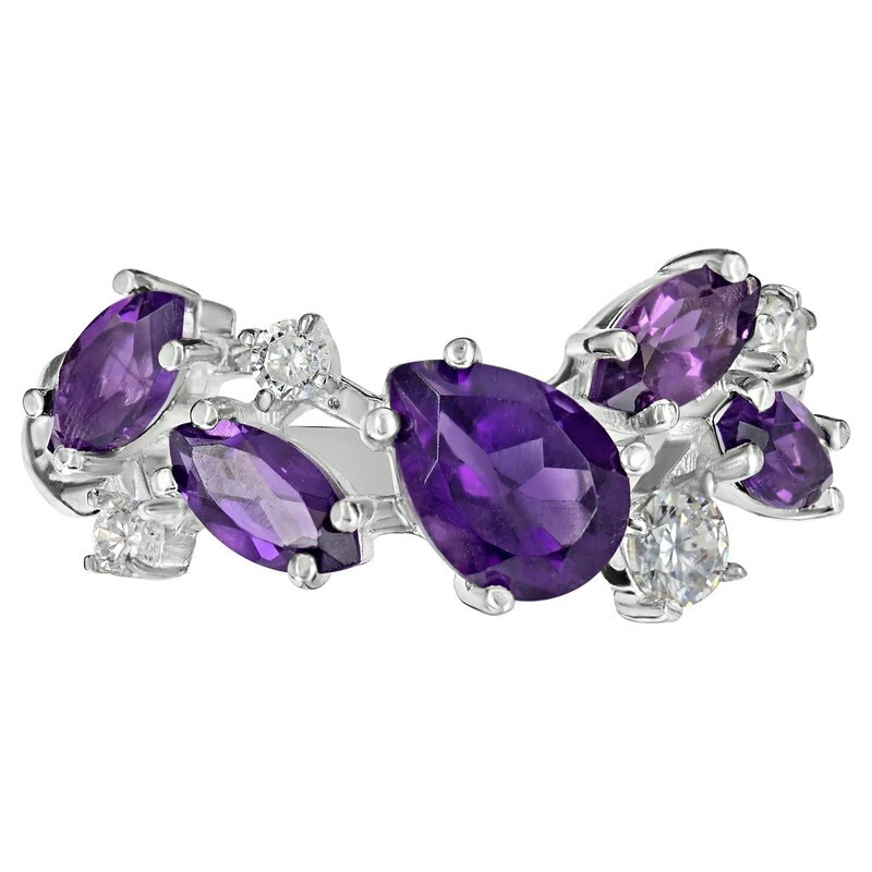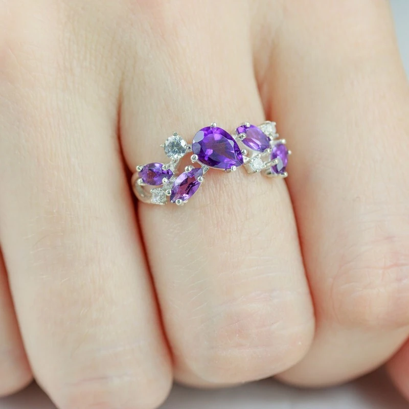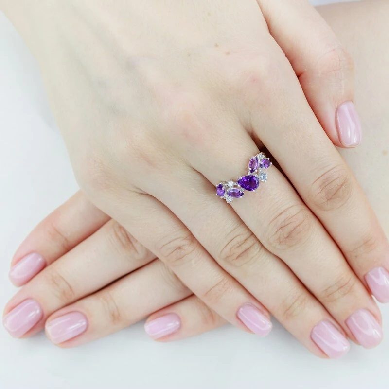 Серебряное кольцо с натуральным аметистом - коллекция Росинка. Средний вес изделия с камнями 2.5 гр. Месторождение: Аметист (Приполярный Урал, Россия). Аметист (Натуральный) груша 5*7 мм., средний вес: 0.65 карат. Все изделия собственного производства, гарантия 12 месяцев. Арт. 8430. Аметист — прозрачный или полупрозрачный камень фиолетовых оттенков, подвид кварца. Он гармонизирует разум, снимает стресс, улучшает кровообращение, способствует умственному развитию и личностному росту. Считается, что он также оберегает от головной боли и бессонницы, служит противоядием, помогает избавиться от алкоголизма и наделяет владельца проницательностью, раскрывая «третий глаз» (за который отвечает чакра аджна). В медитации помогает расслабиться и успокоиться. Положенный под подушку, аметист приносит хорошие сны.