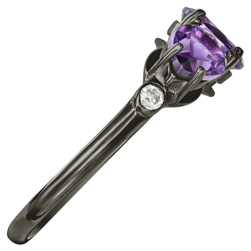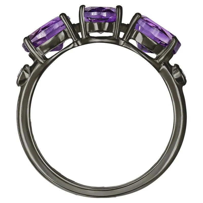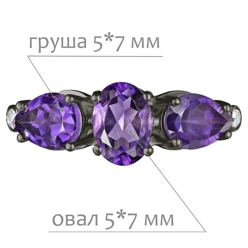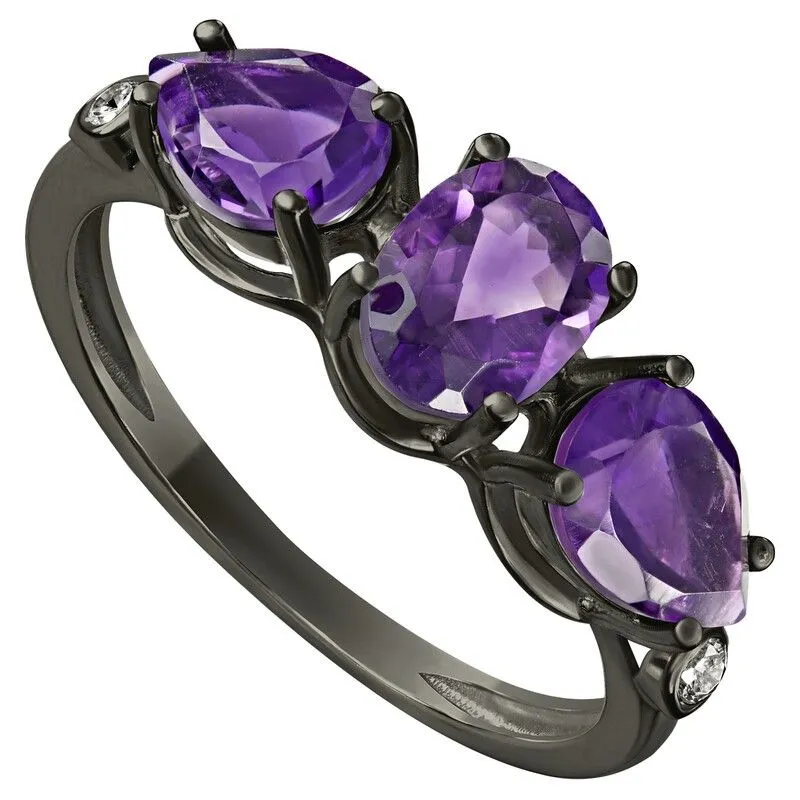 Серебряное кольцо с натуральным аметистом (темный) - коллекция Сансара / покрытие Черный Родий.Средний вес украшения с камнями 2.2 гр.Месторождение(я): Аметист (Приполярный Урал, Россия).Ювелирные вставки:Аметист (Натуральный) овал 5*7 мм., средний вес: 0.72 карат.Аметист (Натуральный) груша 5*7 мм., средний вес: 0.65 карат.Белый Нанокристалл круг 2 мм., средний вес: 0.06 карат.Все изделия собственного производства и имеют гарантию 12 месяцев. Арт. 8638BR. Аметист — прозрачный или полупрозрачный камень фиолетовых оттенков, подвид кварца. Он гармонизирует разум, снимает стресс, улучшает кровообращение, способствует умственному развитию и личностному росту. Считается, что он также оберегает от головной боли и бессонницы, служит противоядием, помогает избавиться от алкоголизма и наделяет владельца проницательностью, раскрывая «третий глаз» (за который отвечает чакра аджна). В медитации помогает расслабиться и успокоиться. Положенный под подушку, аметист приносит хорошие сны.