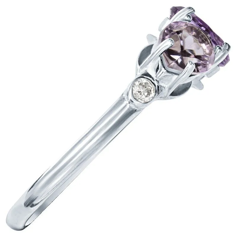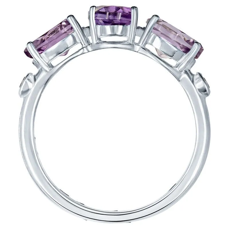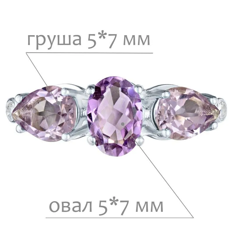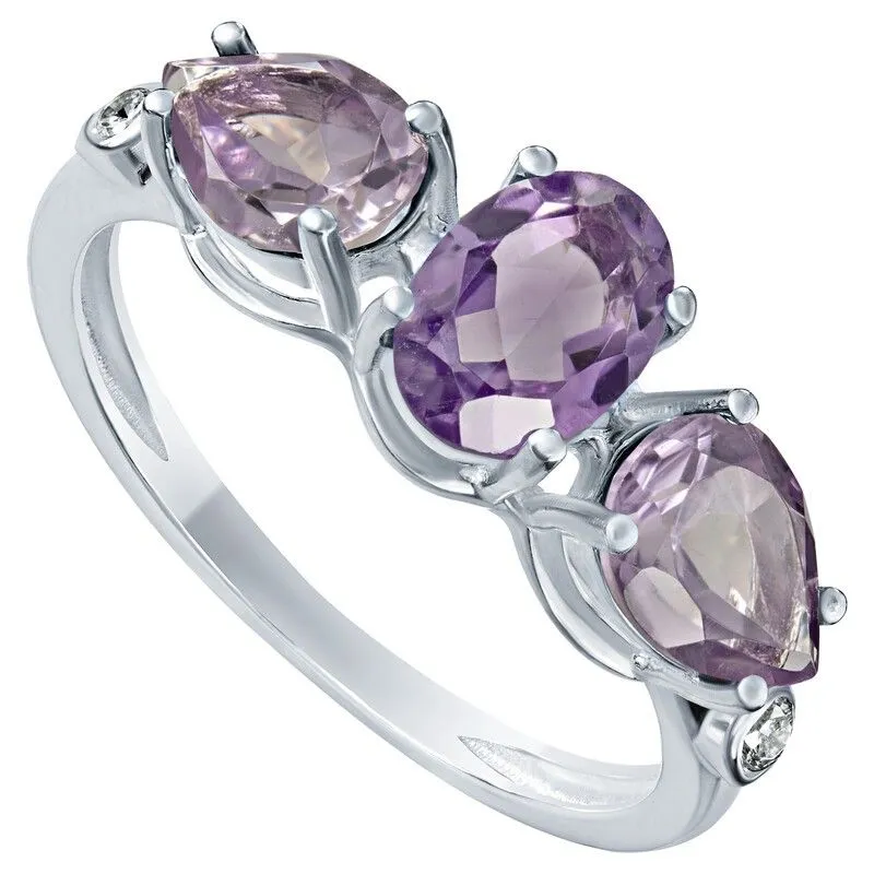 Серебряное кольцо с натуральным аметистом (светлый) - коллекция Сансара / покрытие Чистое Серебро.Средний вес украшения с камнями 2.21 гр.Месторождение(я): Аметист (Приполярный Урал, Россия).Ювелирные вставки:Аметист (Натуральный) овал 5*7 мм., средний вес: 0.72 карат.Аметист (Натуральный) груша 5*7 мм., средний вес: 0.65 карат.Белый Нанокристалл круг 2 мм., средний вес: 0.06 карат.Все изделия собственного производства и имеют гарантию 12 месяцев. Арт. 8639AG. Аметист — прозрачный или полупрозрачный камень фиолетовых оттенков, подвид кварца. Он гармонизирует разум, снимает стресс, улучшает кровообращение, способствует умственному развитию и личностному росту. Считается, что он также оберегает от головной боли и бессонницы, служит противоядием, помогает избавиться от алкоголизма и наделяет владельца проницательностью, раскрывая «третий глаз» (за который отвечает чакра аджна). В медитации помогает расслабиться и успокоиться. Положенный под подушку, аметист приносит хорошие сны.