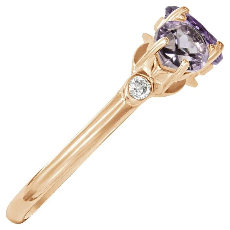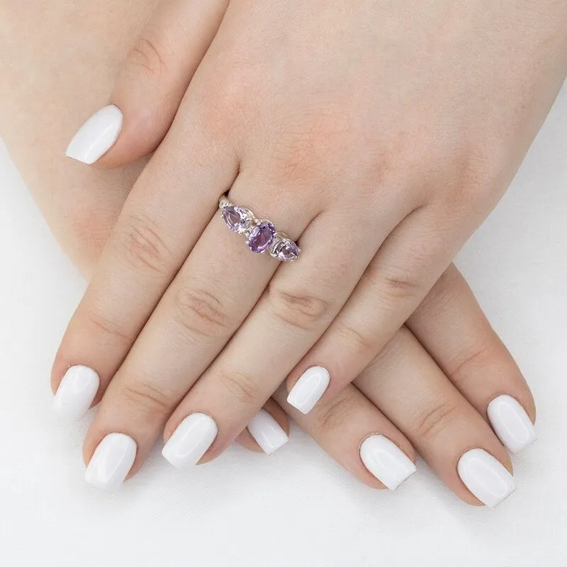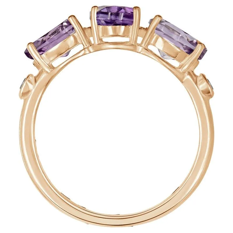 Серебряное кольцо с натуральным аметистом (светлый) - коллекция Сансара / покрытие Розовое Золото.Средний вес украшения с камнями 2.23 гр.Месторождение(я): Аметист (Приполярный Урал, Россия).Ювелирные вставки:Аметист (Натуральный) овал 5*7 мм., средний вес: 0.72 карат.Аметист (Натуральный) груша 5*7 мм., средний вес: 0.65 карат.Белый Нанокристалл круг 2 мм., средний вес: 0.06 карат.Все изделия собственного производства и имеют гарантию 12 месяцев. Арт. 8639PG. Аметист — прозрачный или полупрозрачный камень фиолетовых оттенков, подвид кварца. Он гармонизирует разум, снимает стресс, улучшает кровообращение, способствует умственному развитию и личностному росту. Считается, что он также оберегает от головной боли и бессонницы, служит противоядием, помогает избавиться от алкоголизма и наделяет владельца проницательностью, раскрывая «третий глаз» (за который отвечает чакра аджна). В медитации помогает расслабиться и успокоиться. Положенный под подушку, аметист приносит хорошие сны.