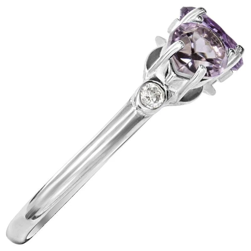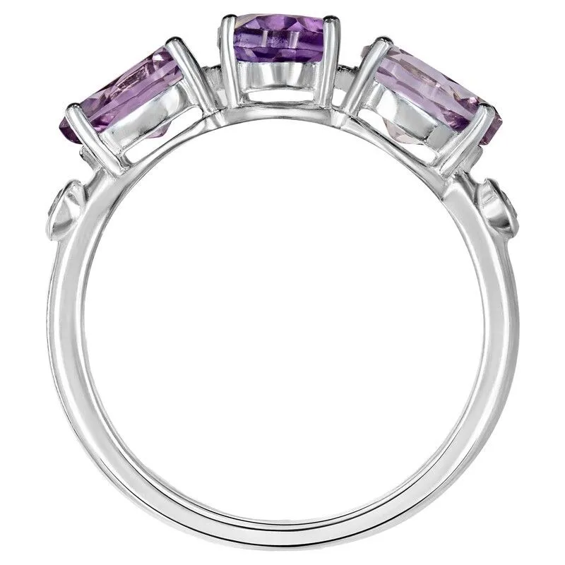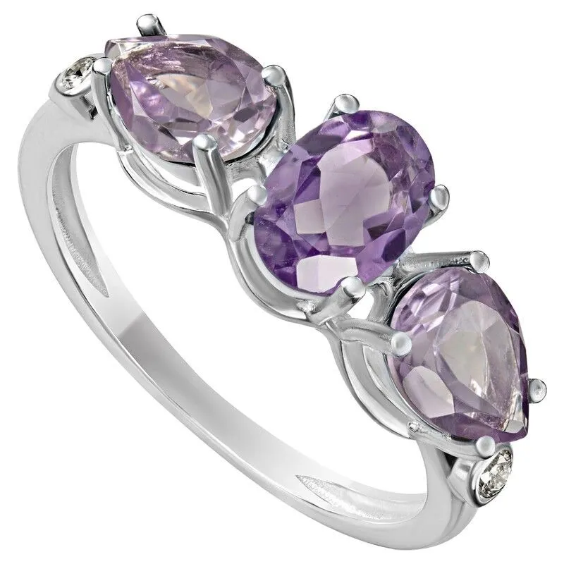Серебряное кольцо с натуральным аметистом (светлый) - коллекция Сансара / покрытие Белый Родий.Средний вес украшения с камнями 2.24 гр.Месторождение(я): Аметист (Приполярный Урал, Россия).Ювелирные вставки:Аметист (Натуральный) овал 5*7 мм., средний вес: 0.72 карат.Аметист (Натуральный) груша 5*7 мм., средний вес: 0.65 карат.Белый Нанокристалл круг 2 мм., средний вес: 0.06 карат.Все изделия собственного производства и имеют гарантию 12 месяцев. Арт. 8639WR. Аметист — прозрачный или полупрозрачный камень фиолетовых оттенков, подвид кварца. Он гармонизирует разум, снимает стресс, улучшает кровообращение, способствует умственному развитию и личностному росту. Считается, что он также оберегает от головной боли и бессонницы, служит противоядием, помогает избавиться от алкоголизма и наделяет владельца проницательностью, раскрывая «третий глаз» (за который отвечает чакра аджна). В медитации помогает расслабиться и успокоиться. Положенный под подушку, аметист приносит хорошие сны.