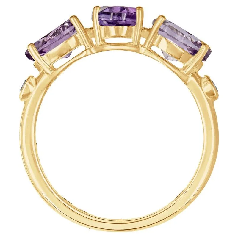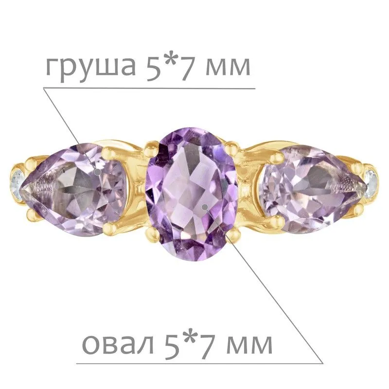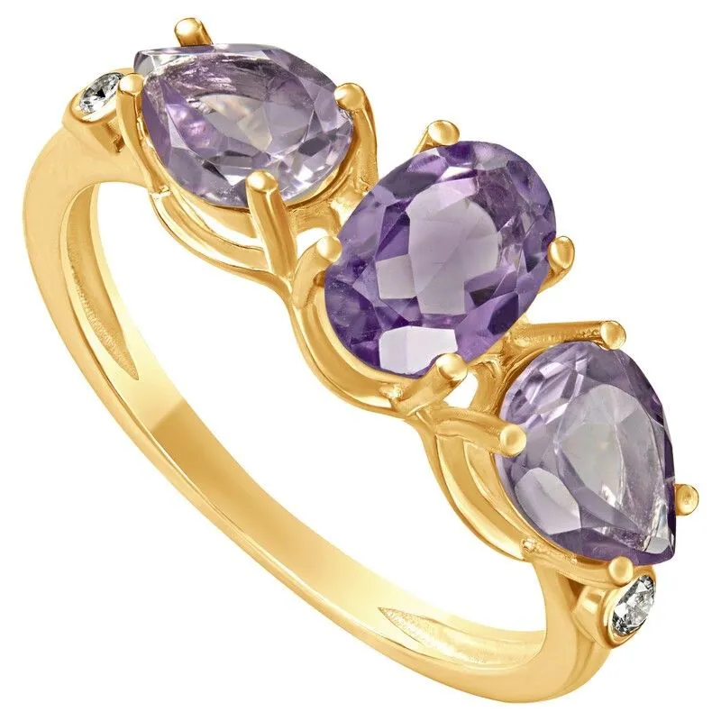 Серебряное кольцо с натуральным аметистом (светлый) - коллекция Сансара / покрытие Желтое Золото.Средний вес украшения с камнями 2.31 гр.Месторождение(я): Аметист (Приполярный Урал, Россия).Ювелирные вставки:Аметист (Натуральный) овал 5*7 мм., средний вес: 0.72 карат.Аметист (Натуральный) груша 5*7 мм., средний вес: 0.65 карат.Белый Нанокристалл круг 2 мм., средний вес: 0.06 карат.Все изделия собственного производства и имеют гарантию 12 месяцев. Арт. 8639YG. Аметист — прозрачный или полупрозрачный камень фиолетовых оттенков, подвид кварца. Он гармонизирует разум, снимает стресс, улучшает кровообращение, способствует умственному развитию и личностному росту. Считается, что он также оберегает от головной боли и бессонницы, служит противоядием, помогает избавиться от алкоголизма и наделяет владельца проницательностью, раскрывая «третий глаз» (за который отвечает чакра аджна). В медитации помогает расслабиться и успокоиться. Положенный под подушку, аметист приносит хорошие сны.