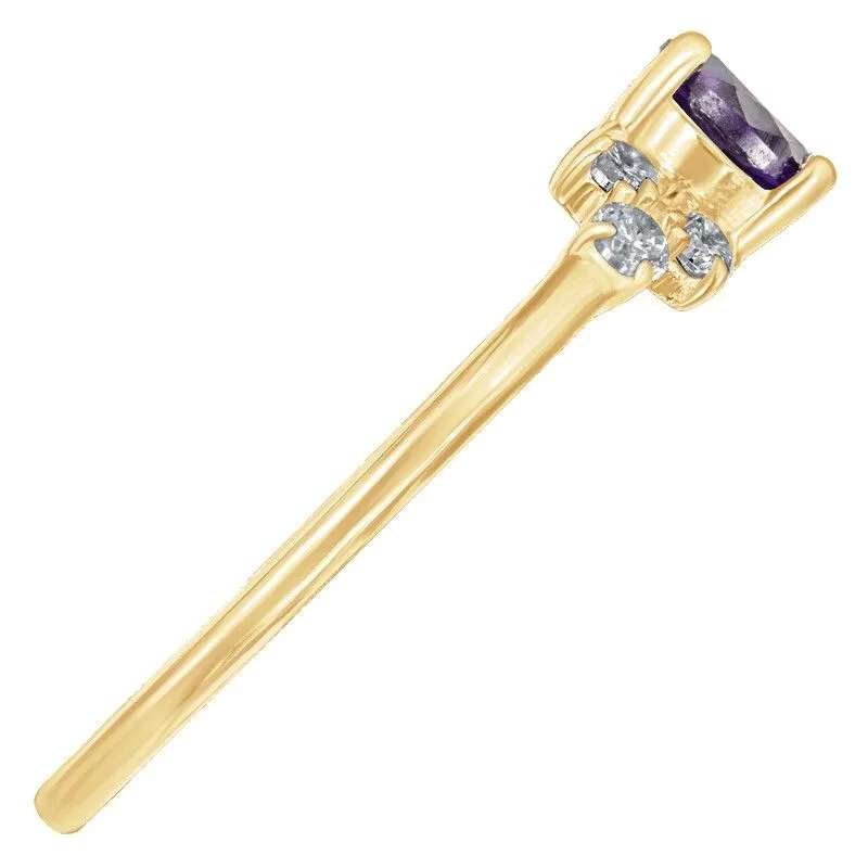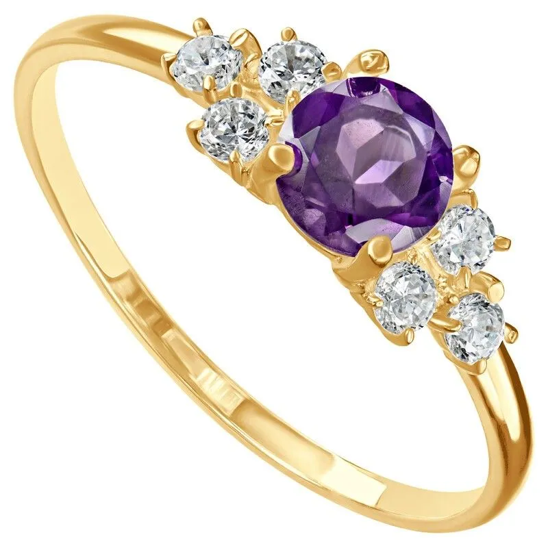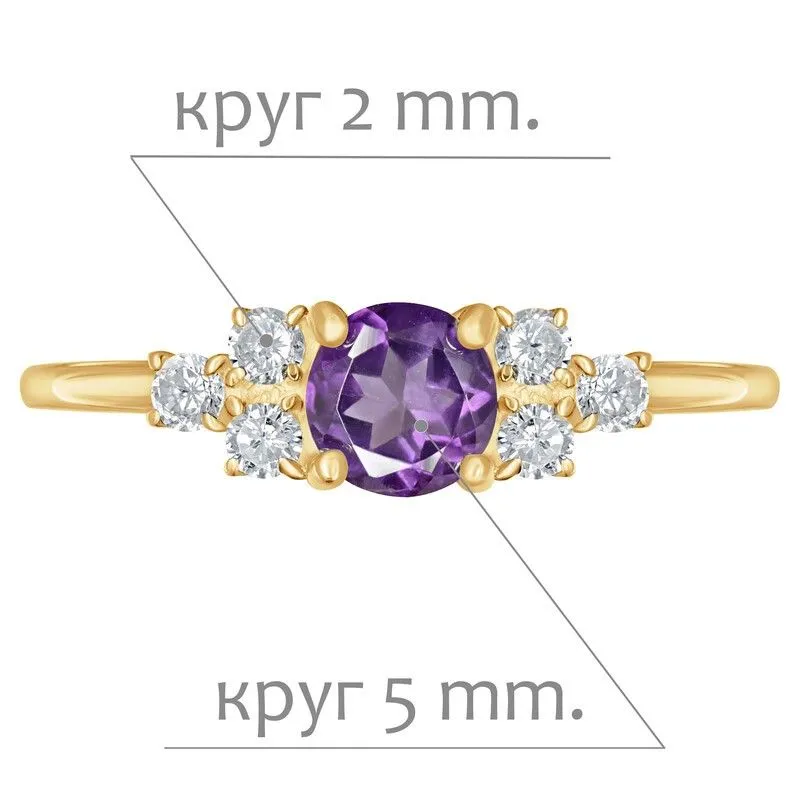 Серебряное кольцо с натуральным аметистом (темный) - коллекция Нова / покрытие Желтое Золото.Средний вес украшения с камнями 1.2 гр.Месторождение(я): Аметист (Приполярный Урал, Россия).Ювелирные вставки:Аметист (Натуральный) круг 5 мм., средний вес: 0.48 карат.Белый Нанокристалл круг 2 мм., средний вес: 0.06 карат.Все изделия собственного производства и имеют гарантию 12 месяцев. Арт. 8653YG. Аметист — прозрачный или полупрозрачный камень фиолетовых оттенков, подвид кварца. Он гармонизирует разум, снимает стресс, улучшает кровообращение, способствует умственному развитию и личностному росту. Считается, что он также оберегает от головной боли и бессонницы, служит противоядием, помогает избавиться от алкоголизма и наделяет владельца проницательностью, раскрывая «третий глаз» (за который отвечает чакра аджна). В медитации помогает расслабиться и успокоиться. Положенный под подушку, аметист приносит хорошие сны.