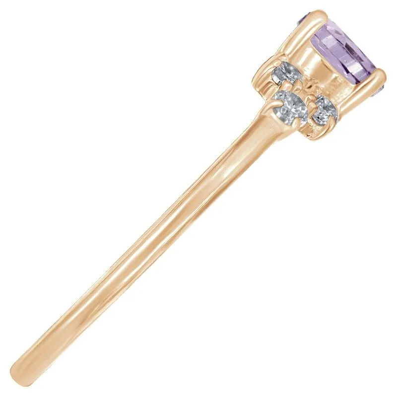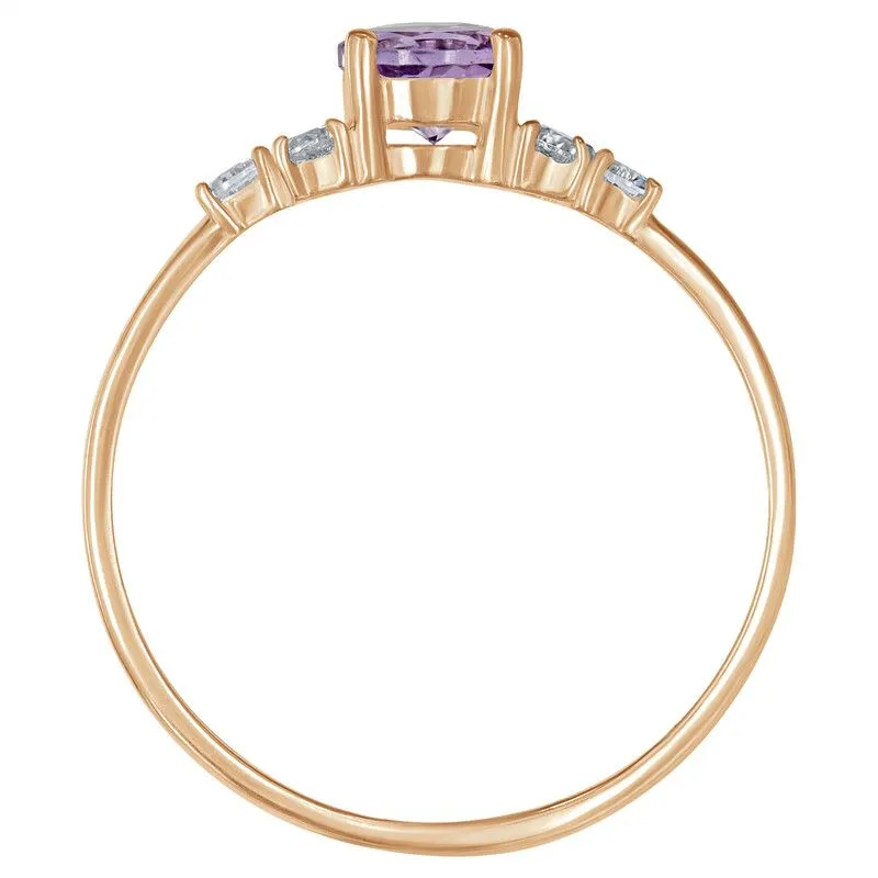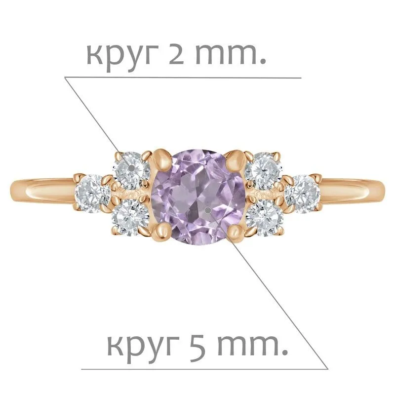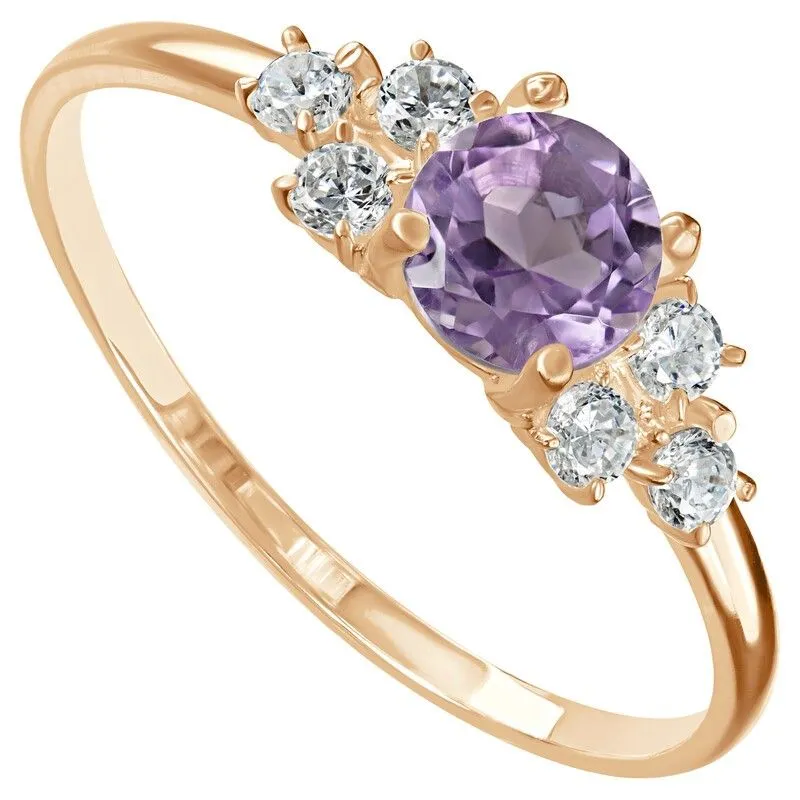 Серебряное кольцо с натуральным аметистом (светлый) - коллекция Нова / покрытие Розовое Золото.Средний вес украшения с камнями 1.21 гр.Месторождение(я): Аметист (Приполярный Урал, Россия).Ювелирные вставки:Аметист (Натуральный) круг 5 мм., средний вес: 0.48 карат.Белый Нанокристалл круг 2 мм., средний вес: 0.06 карат.Все изделия собственного производства и имеют гарантию 12 месяцев. Арт. 8655PG. Аметист — прозрачный или полупрозрачный камень фиолетовых оттенков, подвид кварца. Он гармонизирует разум, снимает стресс, улучшает кровообращение, способствует умственному развитию и личностному росту. Считается, что он также оберегает от головной боли и бессонницы, служит противоядием, помогает избавиться от алкоголизма и наделяет владельца проницательностью, раскрывая «третий глаз» (за который отвечает чакра аджна). В медитации помогает расслабиться и успокоиться. Положенный под подушку, аметист приносит хорошие сны.