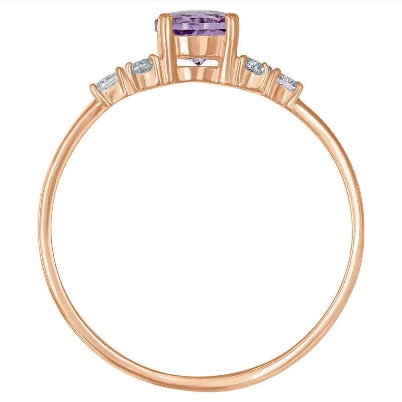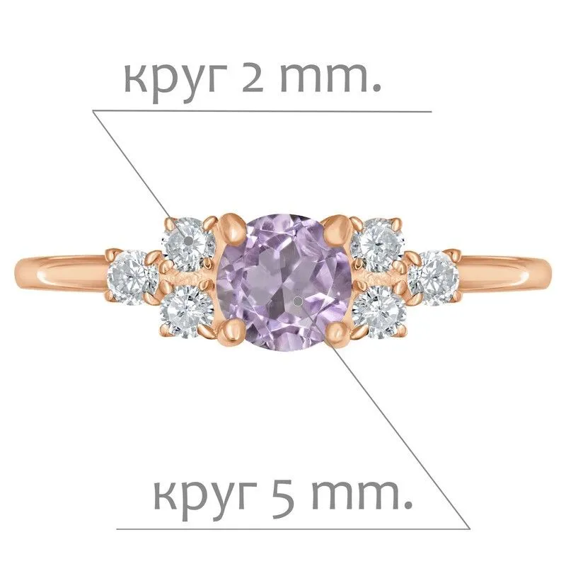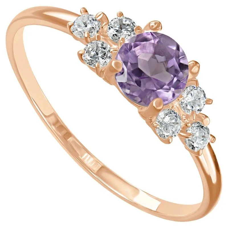 Серебряное кольцо с натуральным аметистом (светлый) - коллекция Нова / покрытие Красное Золото.Средний вес украшения с камнями 1.25 гр.Месторождение(я): Аметист (Приполярный Урал, Россия).Ювелирные вставки:Аметист (Натуральный) круг 5 мм., средний вес: 0.48 карат.Белый Нанокристалл круг 2 мм., средний вес: 0.06 карат.Все изделия собственного производства и имеют гарантию 12 месяцев. Арт. 8655RG. Аметист — прозрачный или полупрозрачный камень фиолетовых оттенков, подвид кварца. Он гармонизирует разум, снимает стресс, улучшает кровообращение, способствует умственному развитию и личностному росту. Считается, что он также оберегает от головной боли и бессонницы, служит противоядием, помогает избавиться от алкоголизма и наделяет владельца проницательностью, раскрывая «третий глаз» (за который отвечает чакра аджна). В медитации помогает расслабиться и успокоиться. Положенный под подушку, аметист приносит хорошие сны.