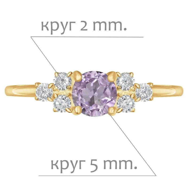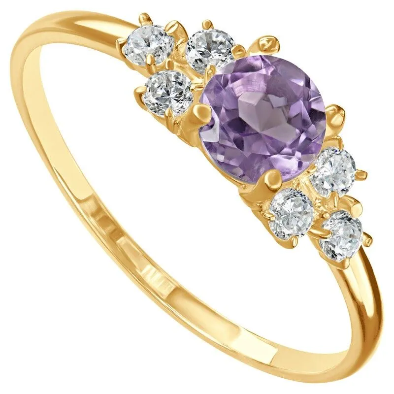 Серебряное кольцо с натуральным аметистом (светлый) - коллекция Нова / покрытие Желтое Золото.Средний вес украшения с камнями 1.26 гр.Месторождение(я): Аметист (Приполярный Урал, Россия).Ювелирные вставки:Аметист (Натуральный) круг 5 мм., средний вес: 0.48 карат.Белый Нанокристалл круг 2 мм., средний вес: 0.06 карат.Все изделия собственного производства и имеют гарантию 12 месяцев. Арт. 8655YG. Аметист — прозрачный или полупрозрачный камень фиолетовых оттенков, подвид кварца. Он гармонизирует разум, снимает стресс, улучшает кровообращение, способствует умственному развитию и личностному росту. Считается, что он также оберегает от головной боли и бессонницы, служит противоядием, помогает избавиться от алкоголизма и наделяет владельца проницательностью, раскрывая «третий глаз» (за который отвечает чакра аджна). В медитации помогает расслабиться и успокоиться. Положенный под подушку, аметист приносит хорошие сны.