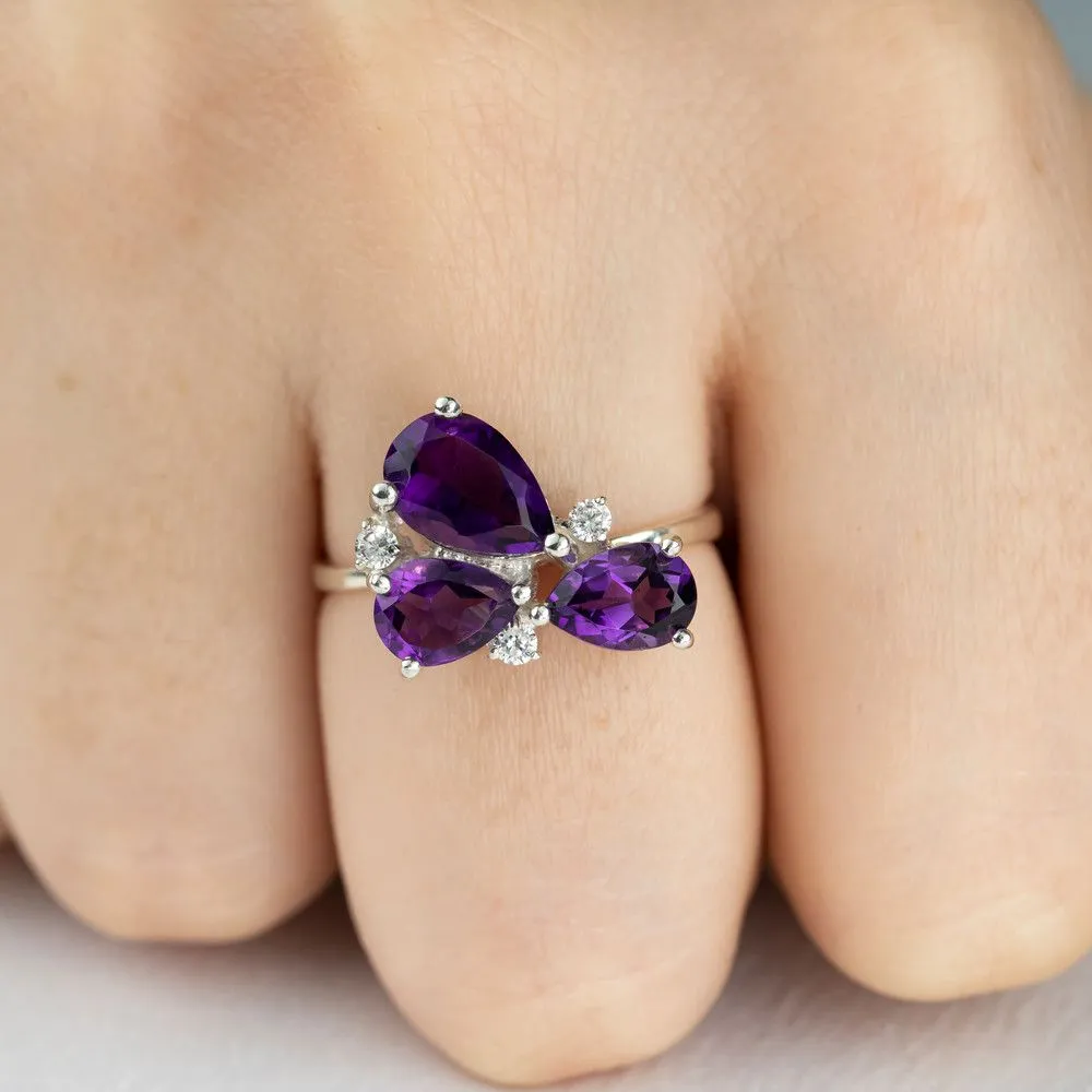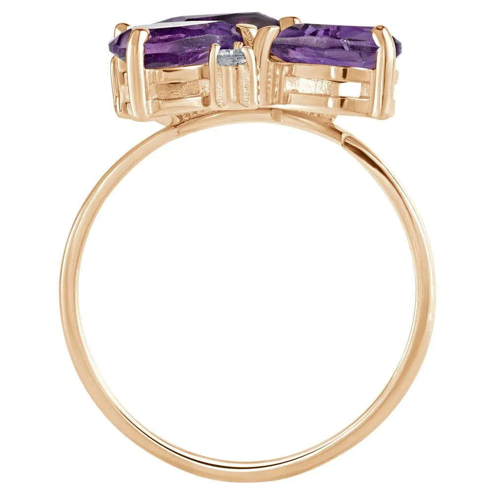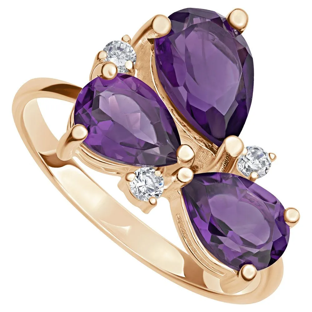 Серебряное кольцо с натуральным аметистом (темным) - коллекция Капель / покрытие Розовое Золото. Средний вес украшения с камнями 3.05 гр. Месторождение: Аметист (Приполярный Урал, Россия) Ювелирные вставки: Аметист (Натуральный) груша 6*9 мм., средний вес: 1.24 карат. Аметист (Натуральный) груша 5*7 мм., средний вес: 0.65 карат. Все изделия собственного производства и имеют гарантию 12 месяцев. Арт. 8770PG. Аметист — прозрачный или полупрозрачный камень фиолетовых оттенков, подвид кварца. Он гармонизирует разум, снимает стресс, улучшает кровообращение, способствует умственному развитию и личностному росту. Считается, что он также оберегает от головной боли и бессонницы, служит противоядием, помогает избавиться от алкоголизма и наделяет владельца проницательностью, раскрывая «третий глаз» (за который отвечает чакра аджна). В медитации помогает расслабиться и успокоиться. Положенный под подушку, аметист приносит хорошие сны.