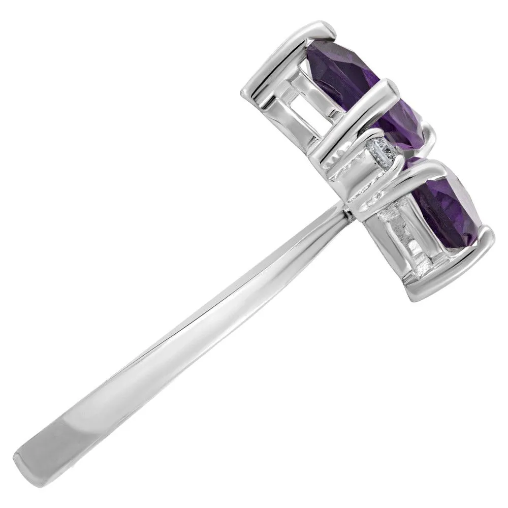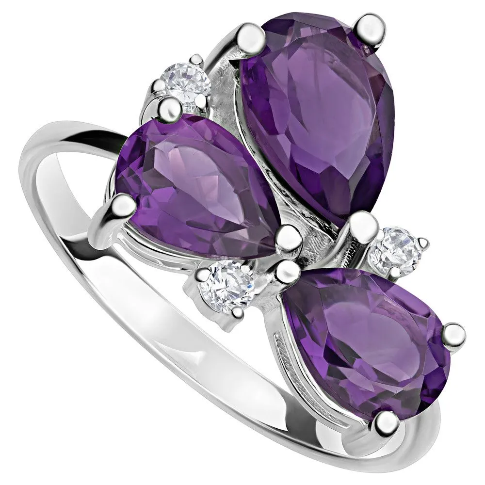 Серебряное кольцо с натуральным аметистом (темным) - коллекция Капель / покрытие Белый Родий. Средний вес украшения с камнями 3.08 гр. Месторождение: Аметист (Приполярный Урал, Россия) Ювелирные вставки: Аметист (Натуральный) груша 6*9 мм., средний вес: 1.24 карат. Аметист (Натуральный) груша 5*7 мм., средний вес: 0.65 карат. Все изделия собственного производства и имеют гарантию 12 месяцев. Арт. 8770WR. Аметист — прозрачный или полупрозрачный камень фиолетовых оттенков, подвид кварца. Он гармонизирует разум, снимает стресс, улучшает кровообращение, способствует умственному развитию и личностному росту. Считается, что он также оберегает от головной боли и бессонницы, служит противоядием, помогает избавиться от алкоголизма и наделяет владельца проницательностью, раскрывая «третий глаз» (за который отвечает чакра аджна). В медитации помогает расслабиться и успокоиться. Положенный под подушку, аметист приносит хорошие сны.