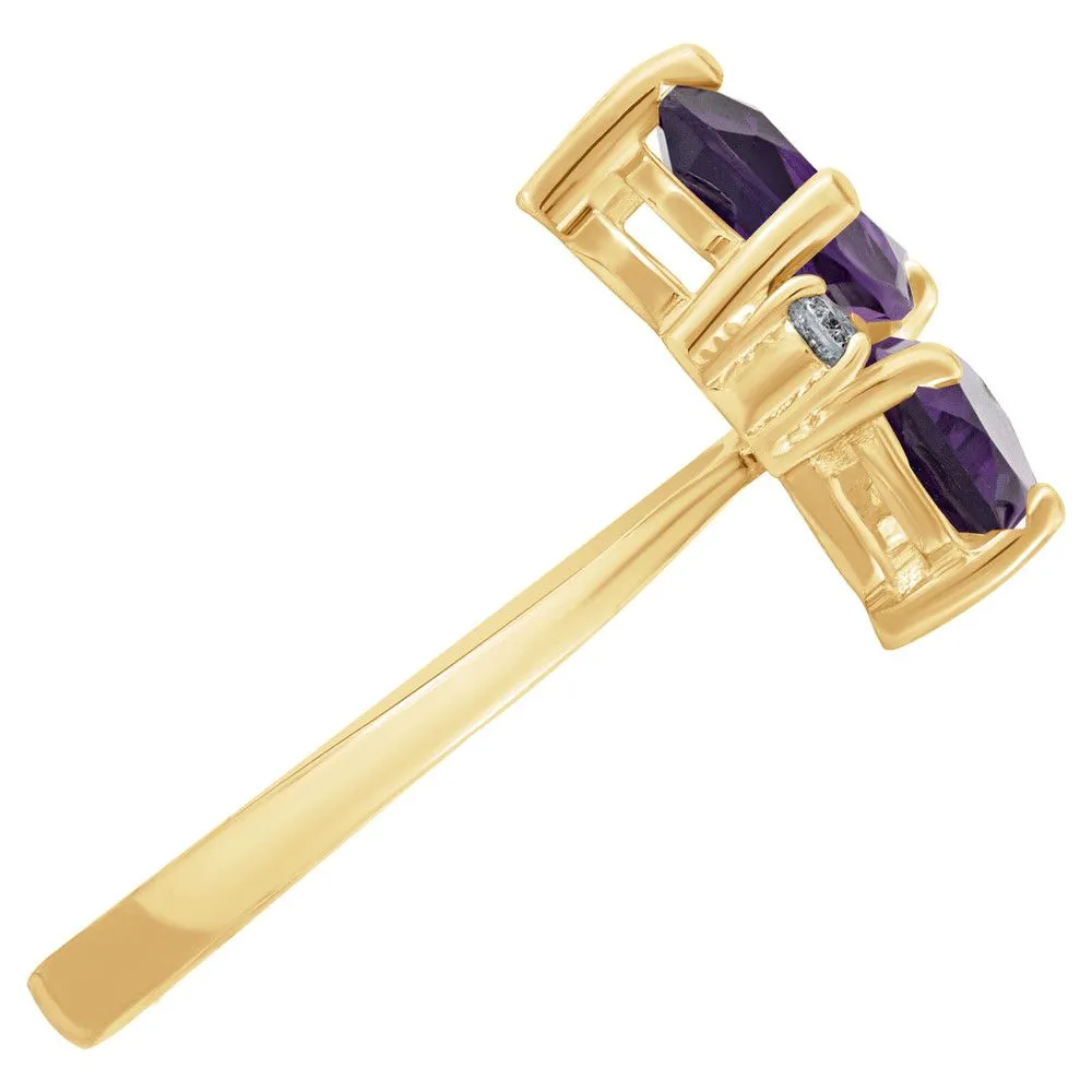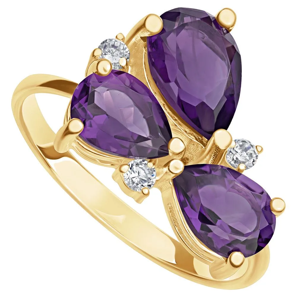 Серебряное кольцо с натуральным аметистом (темным) - коллекция Капель / покрытие Желтое Золото. Средний вес украшения с камнями 3.05 гр. Месторождение: Аметист (Приполярный Урал, Россия) Ювелирные вставки: Аметист (Натуральный) груша 6*9 мм., средний вес: 1.24 карат. Аметист (Натуральный) груша 5*7 мм., средний вес: 0.65 карат. Все изделия собственного производства и имеют гарантию 12 месяцев. Арт. 8770YG. Аметист — прозрачный или полупрозрачный камень фиолетовых оттенков, подвид кварца. Он гармонизирует разум, снимает стресс, улучшает кровообращение, способствует умственному развитию и личностному росту. Считается, что он также оберегает от головной боли и бессонницы, служит противоядием, помогает избавиться от алкоголизма и наделяет владельца проницательностью, раскрывая «третий глаз» (за который отвечает чакра аджна). В медитации помогает расслабиться и успокоиться. Положенный под подушку, аметист приносит хорошие сны.