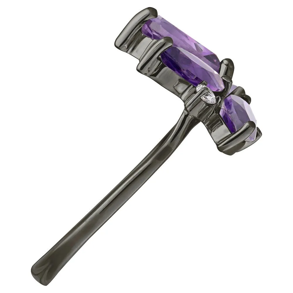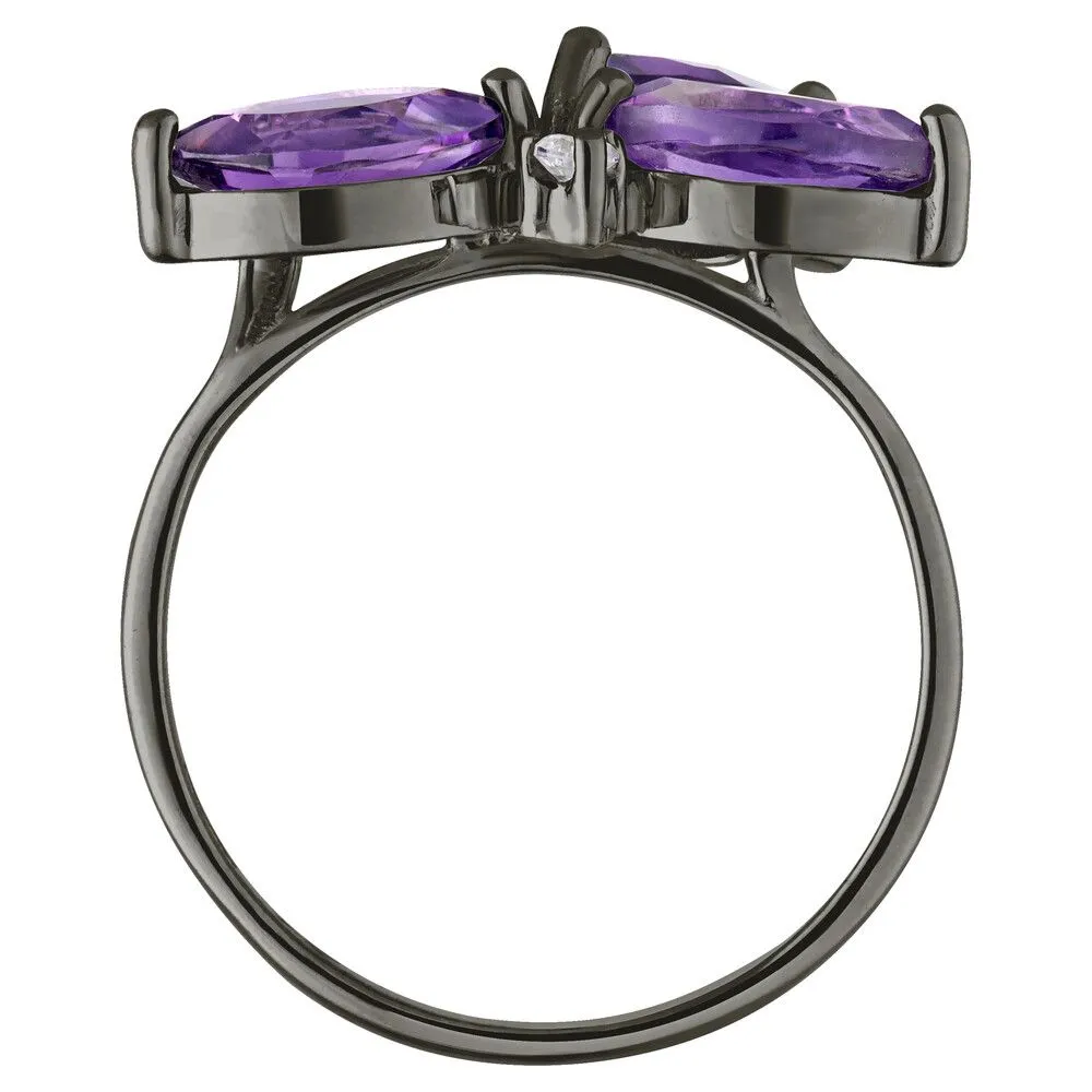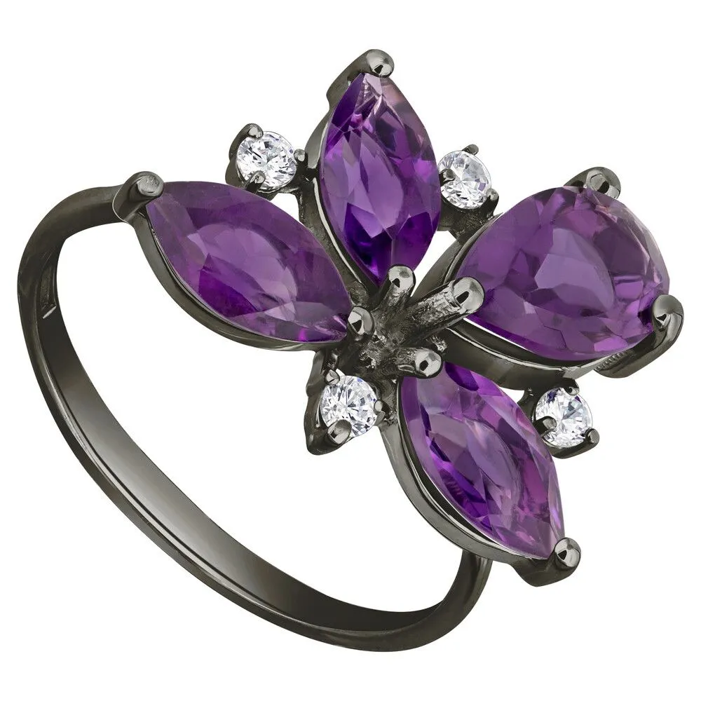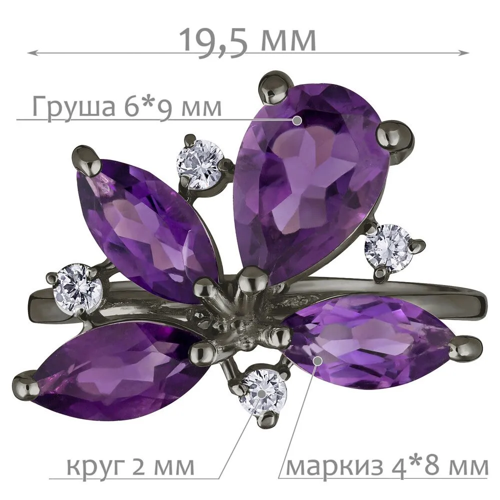 Серебряное кольцо с натуральным аметистом (темным) - коллекция Аврора / Черный Родий. Средний вес украшения с камнями 3.09 гр. Месторождение: Аметист (Приполярный Урал, Россия). Ювелирные вставки: Аметист (Натуральный) груша 6*9 мм., средний вес: 1.23 карат. Аметист (Натуральный) маркиз 4*8 мм., средний вес: 0.54 карат. Белый Нанокристалл круг 2 мм. Все изделия собственного производства и имеют гарантию 12 месяцев, к каждому изделию прилагается паспорт. Арт. 8908BR