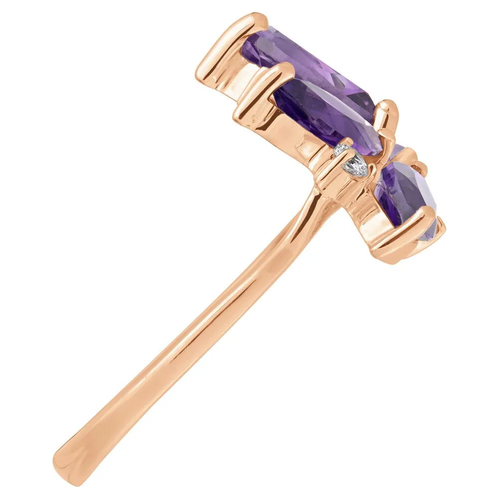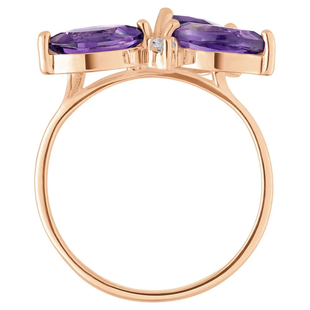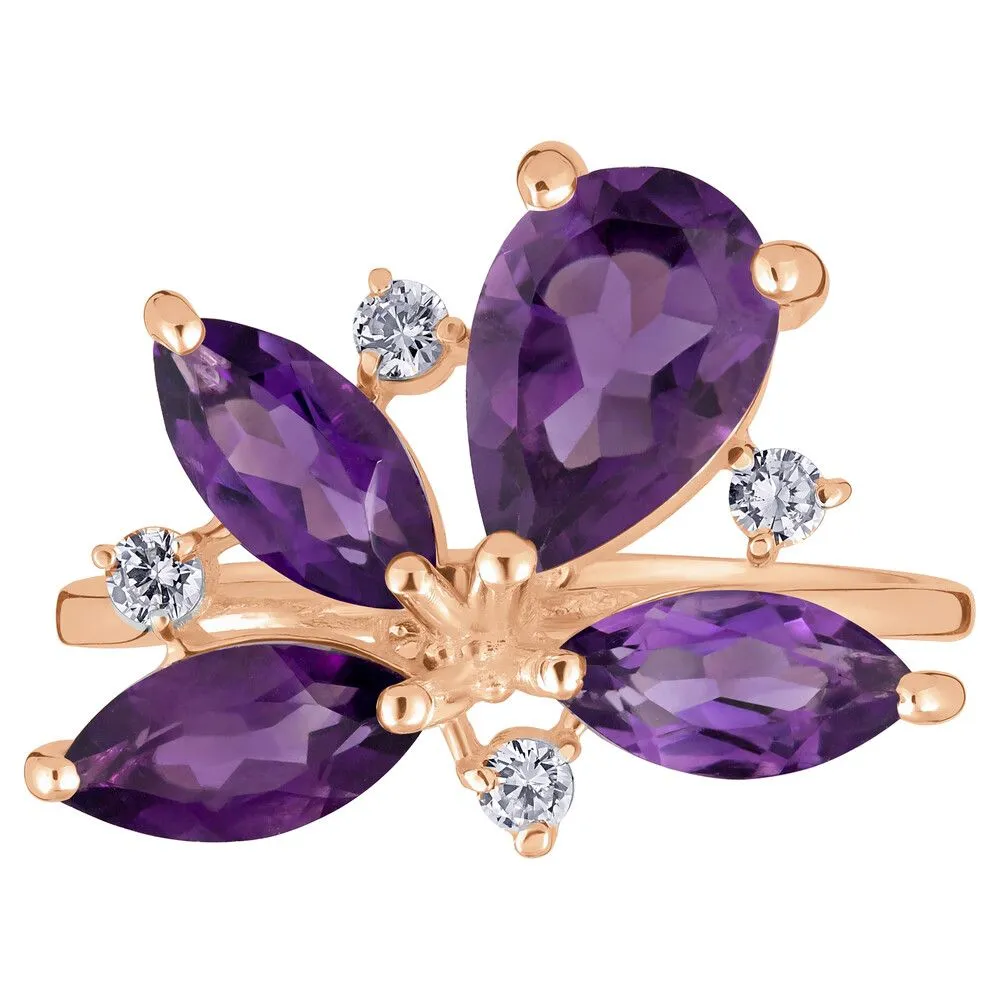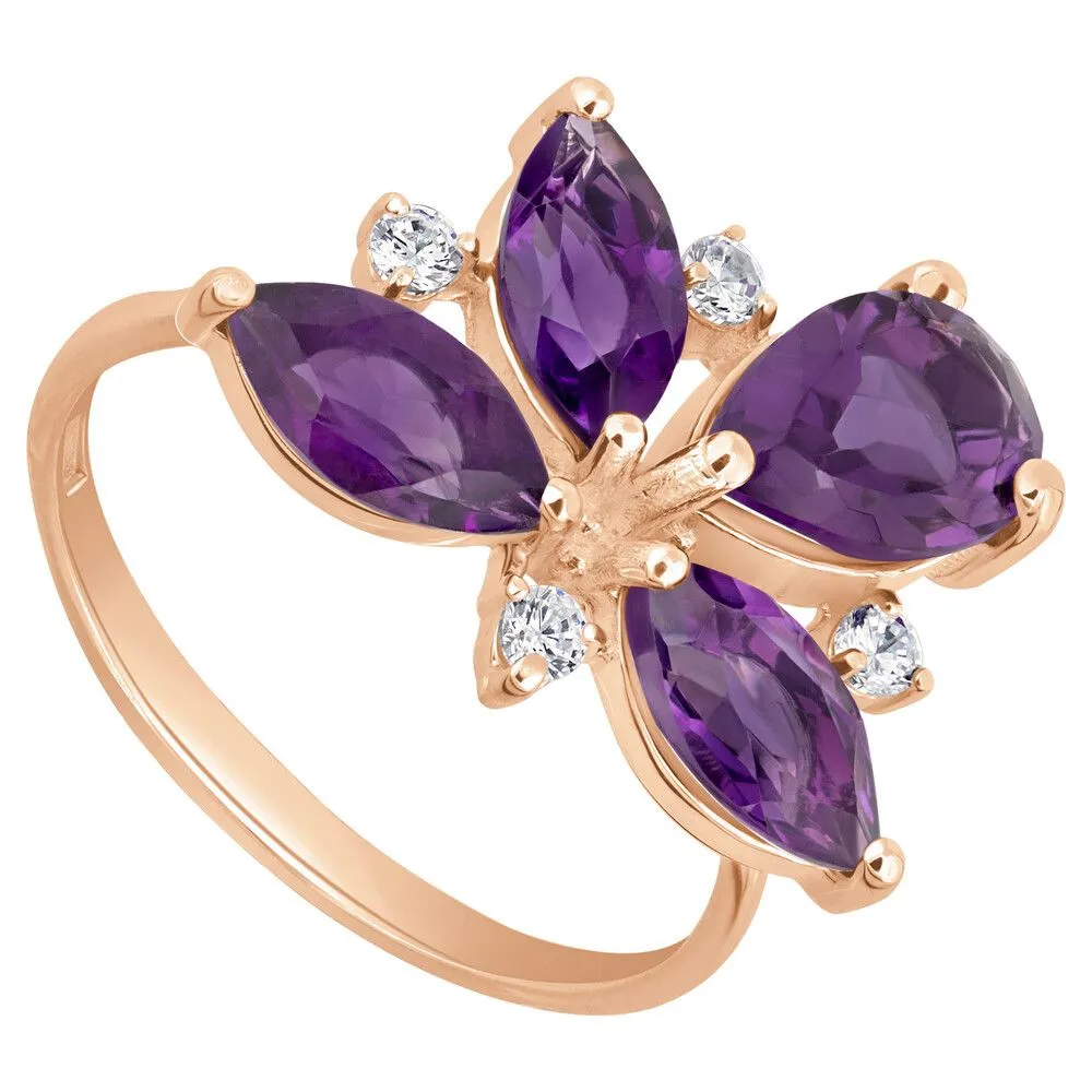 Серебряное кольцо с натуральным аметистом (темным) - коллекция Аврора / Красное Золото. Средний вес украшения с камнями 3.09 гр. Месторождение: Аметист (Приполярный Урал, Россия). Ювелирные вставки: Аметист (Натуральный) груша 6*9 мм., средний вес: 1.23 карат. Аметист (Натуральный) маркиз 4*8 мм., средний вес: 0.54 карат. Белый Нанокристалл круг 2 мм. Все изделия собственного производства и имеют гарантию 12 месяцев, к каждому изделию прилагается паспорт. Арт. 8908RG