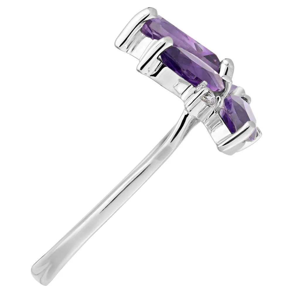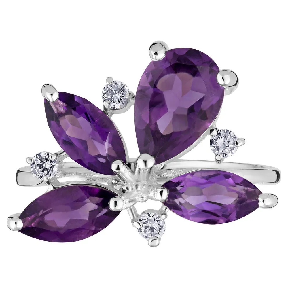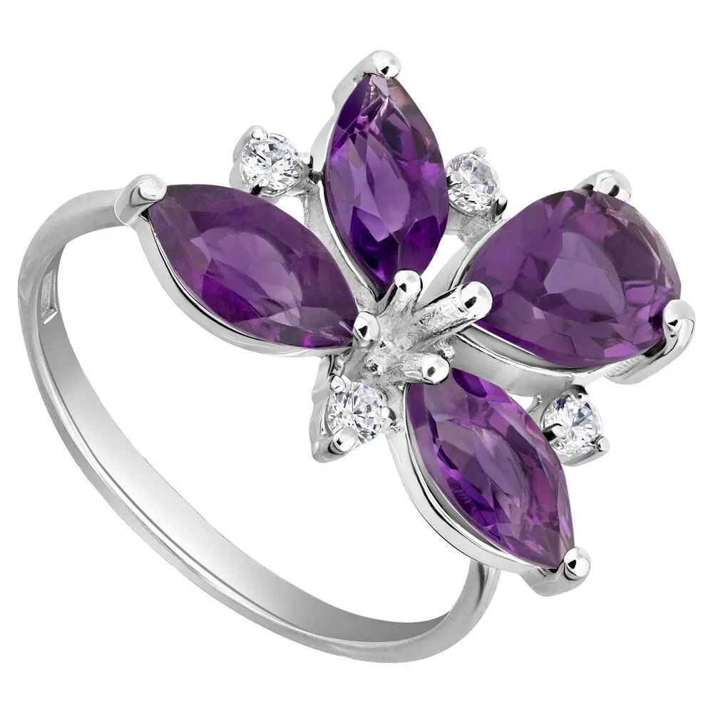 Серебряное кольцо с натуральным аметистом (темным) - коллекция Аврора / Белый Родий. Средний вес украшения с камнями 3.09 гр. Месторождение: Аметист (Приполярный Урал, Россия). Ювелирные вставки: Аметист (Натуральный) груша 6*9 мм., средний вес: 1.23 карат. Аметист (Натуральный) маркиз 4*8 мм., средний вес: 0.54 карат. Белый Нанокристалл круг 2 мм. Все изделия собственного производства и имеют гарантию 12 месяцев, к каждому изделию прилагается паспорт. Арт. 8908WR