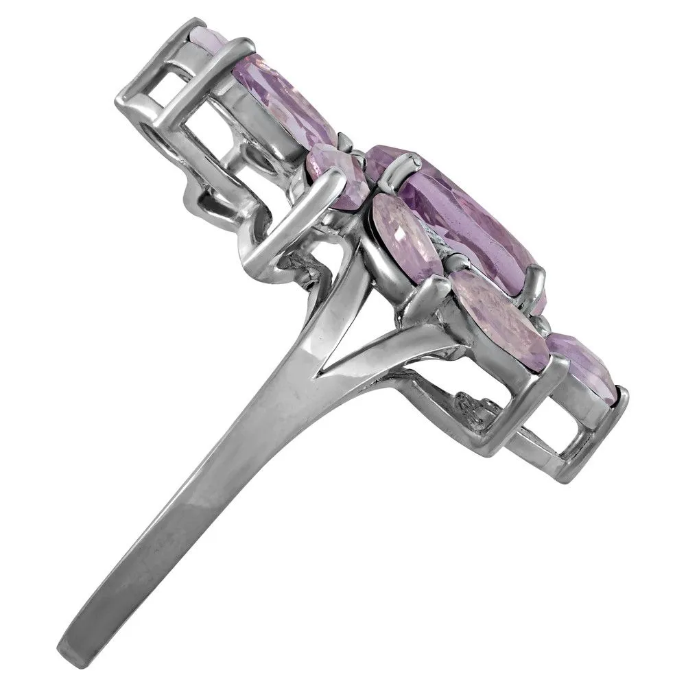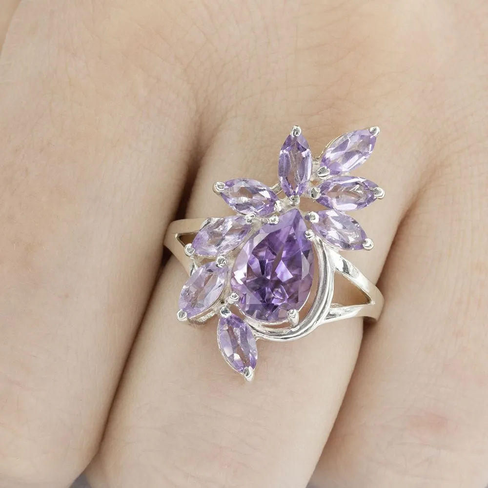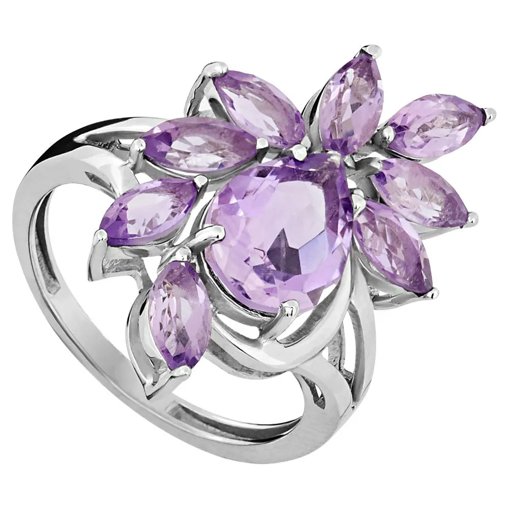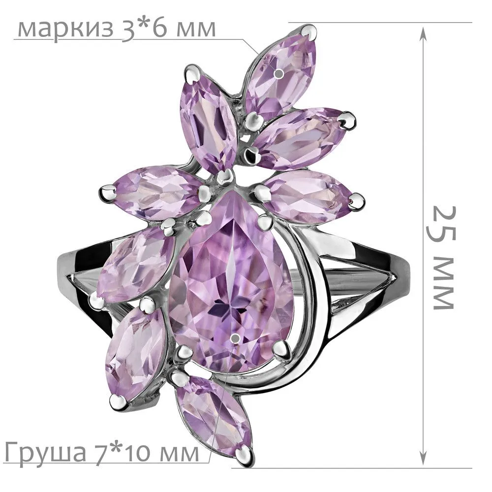 Серебряное кольцо "Элегия" с натуральным аметистом, покрытие Палладий. Средний вес украшения с камнями 3,43 гр. Месторождение(я) камней: Аметист (Приполярный Урал, Россия). Аметист (Натуральный) груша: 7*10 мм., средний вес: 1,77 карат. Аметист (Натуральный) маркиз: 3*6 мм., средний вес: 0,22 карат. Размер лицевой части: 15*23 мм. Все изделия собственного производства и имеют гарантию 12 месяцев. Арт. 6609PD. Аметист — прозрачный или полупрозрачный камень фиолетовых оттенков, подвид кварца. Он гармонизирует разум, снимает стресс, улучшает кровообращение, способствует умственному развитию и личностному росту. Считается, что он также оберегает от головной боли и бессонницы, служит противоядием, помогает избавиться от алкоголизма и наделяет владельца проницательностью, раскрывая «третий глаз» (за который отвечает чакра аджна). В медитации помогает расслабиться и успокоиться. Положенный под подушку, аметист приносит хорошие сны.