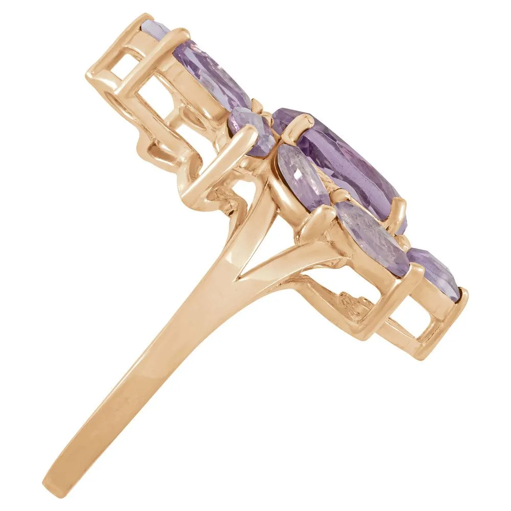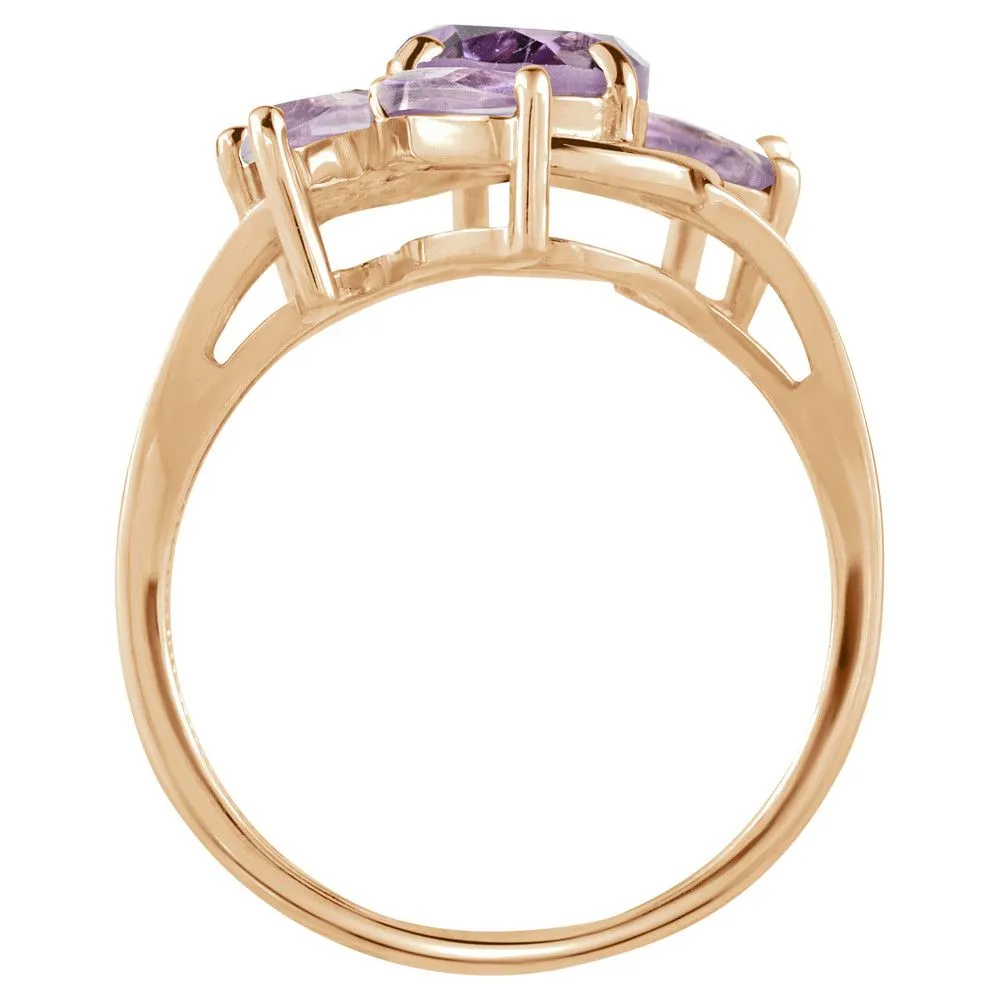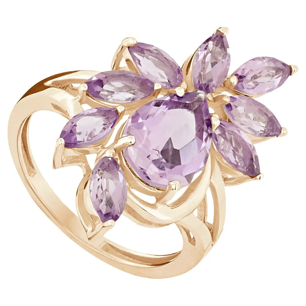 Серебряное кольцо "Элегия" с натуральным аметистом, покрытие Розовое Золото. Средний вес украшения с камнями 3,43 гр. Месторождение(я) камней: Аметист (Приполярный Урал, Россия). Аметист (Натуральный) груша: 7*10 мм., средний вес: 1,77 карат. Аметист (Натуральный) маркиз: 3*6 мм., средний вес: 0,22 карат. Размер лицевой части: 15*23 мм. Все изделия собственного производства и имеют гарантию 12 месяцев. Арт. 6609PG. Аметист — прозрачный или полупрозрачный камень фиолетовых оттенков, подвид кварца. Он гармонизирует разум, снимает стресс, улучшает кровообращение, способствует умственному развитию и личностному росту. Считается, что он также оберегает от головной боли и бессонницы, служит противоядием, помогает избавиться от алкоголизма и наделяет владельца проницательностью, раскрывая «третий глаз» (за который отвечает чакра аджна). В медитации помогает расслабиться и успокоиться. Положенный под подушку, аметист приносит хорошие сны.