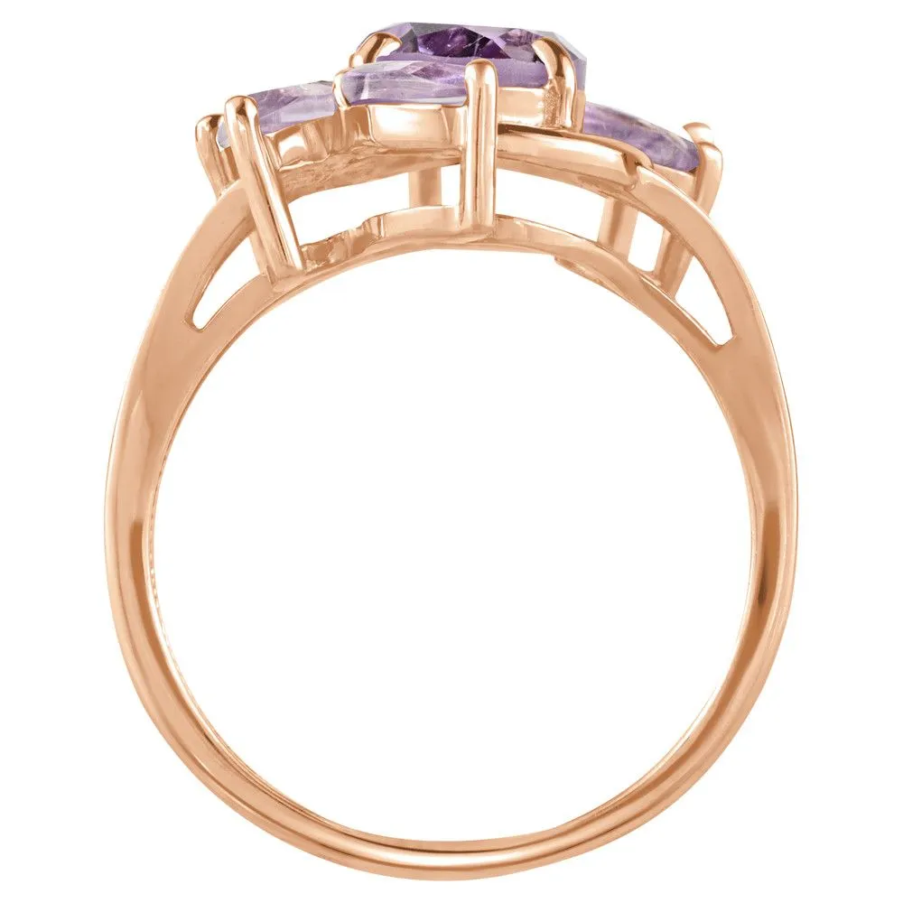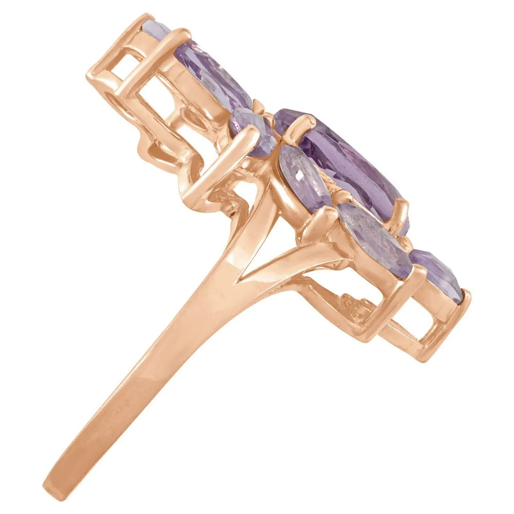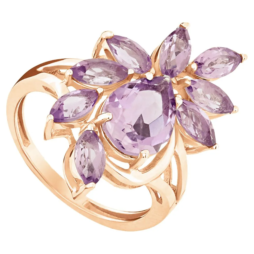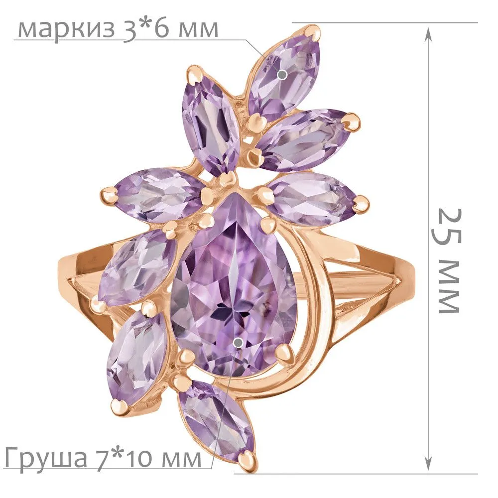 Серебряное кольцо "Элегия" с натуральным аметистом, покрытие Красное Золото. Средний вес украшения с камнями 3,43 гр. Месторождение(я) камней: Аметист (Приполярный Урал, Россия). Аметист (Натуральный) груша: 7*10 мм., средний вес: 1,77 карат. Аметист (Натуральный) маркиз: 3*6 мм., средний вес: 0,22 карат. Размер лицевой части: 15*23 мм. Все изделия собственного производства и имеют гарантию 12 месяцев. Арт. 6609RG. Аметист — прозрачный или полупрозрачный камень фиолетовых оттенков, подвид кварца. Он гармонизирует разум, снимает стресс, улучшает кровообращение, способствует умственному развитию и личностному росту. Считается, что он также оберегает от головной боли и бессонницы, служит противоядием, помогает избавиться от алкоголизма и наделяет владельца проницательностью, раскрывая «третий глаз» (за который отвечает чакра аджна). В медитации помогает расслабиться и успокоиться. Положенный под подушку, аметист приносит хорошие сны.