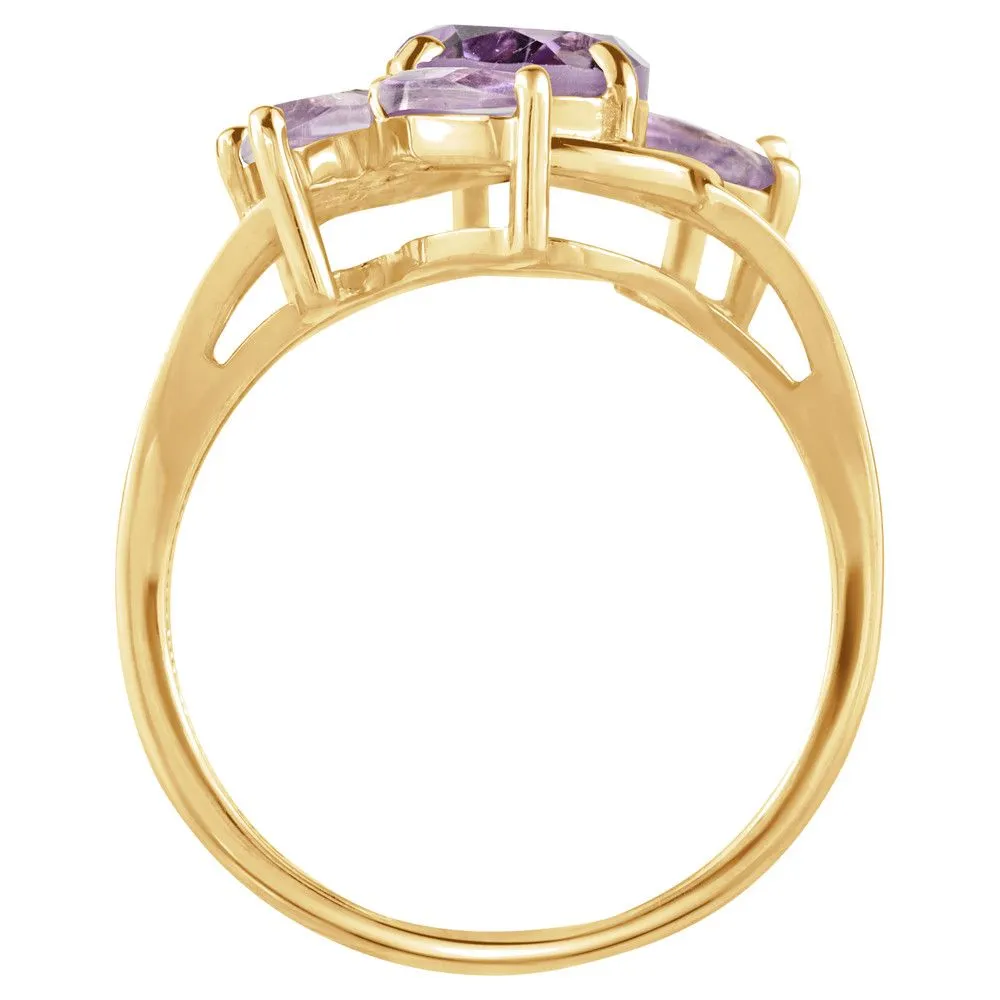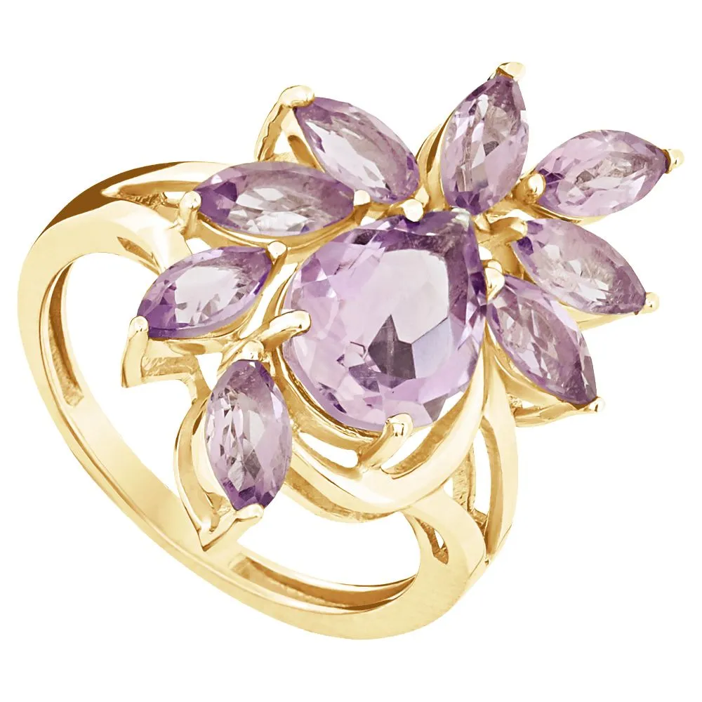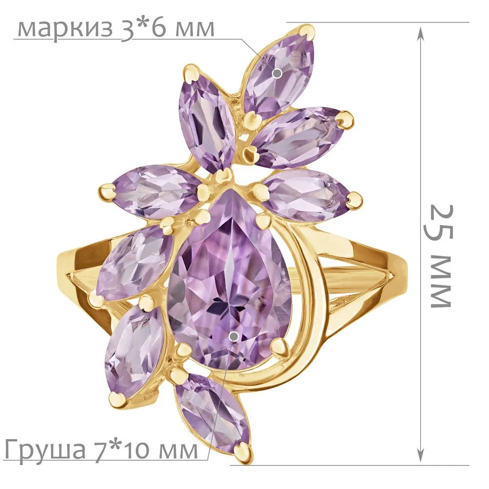 Серебряное кольцо "Элегия" с натуральным аметистом, покрытие Желтое Золото. Средний вес украшения с камнями 3,43 гр. Месторождение(я) камней: Аметист (Приполярный Урал, Россия). Аметист (Натуральный) груша: 7*10 мм., средний вес: 1,77 карат. Аметист (Натуральный) маркиз: 3*6 мм., средний вес: 0,22 карат. Размер лицевой части: 15*23 мм. Все изделия собственного производства и имеют гарантию 12 месяцев. Арт. 6609YG. Аметист — прозрачный или полупрозрачный камень фиолетовых оттенков, подвид кварца. Он гармонизирует разум, снимает стресс, улучшает кровообращение, способствует умственному развитию и личностному росту. Считается, что он также оберегает от головной боли и бессонницы, служит противоядием, помогает избавиться от алкоголизма и наделяет владельца проницательностью, раскрывая «третий глаз» (за который отвечает чакра аджна). В медитации помогает расслабиться и успокоиться. Положенный под подушку, аметист приносит хорошие сны.