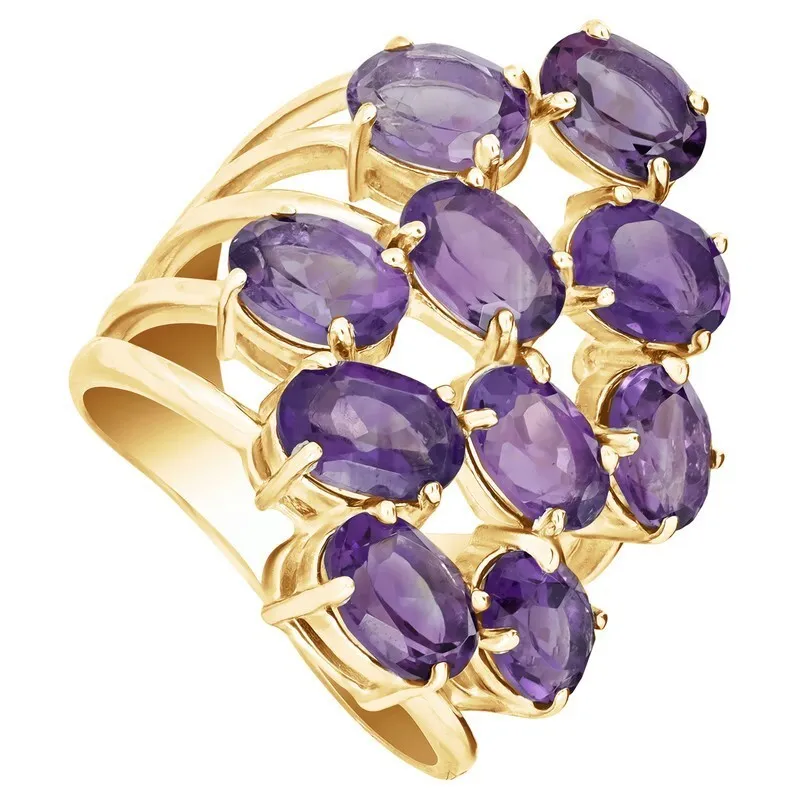 Серебряное кольцо с натуральным аметистом - коллекция Аэлита. Серебряное кольцо 925 пробы с покрытием желтое золото. Цвет покрытия соответствует швейцарскому цветовому стандарту NIHS -FF24ct и цвету чистого золото 999.99. На последней фотографии мы разместили сравнительную фотографию 3 цвета золотого покрытия. Помимо предания золотого цвета Вашему изделию, тонкий слой золота защищает от окисления. Для более стойкого эффекта золочения и долговечности покрытия мы дополнительно наносим подслой палладия (Pd). Средний вес изделия с камнями 9.56 гр. Месторождение: Аметист (Приполярный Урал, Россия). Аметист (Натуральный) овал 5*7 мм., средний вес: 0.81 карат. Все изделия собственного производства, гарантия 12 месяцев. Арт. 7835. Аметист — прозрачный или полупрозрачный камень фиолетовых оттенков, подвид кварца. Он гармонизирует разум, снимает стресс, улучшает кровообращение, способствует умственному развитию и личностному росту. Считается, что он также оберегает от головной боли и бессонницы, служит противоядием, помогает избавиться от алкоголизма и наделяет владельца проницательностью, раскрывая «третий глаз» (за который отвечает чакра аджна). В медитации помогает расслабиться и успокоиться. Положенный под подушку, аметист приносит хорошие сны.