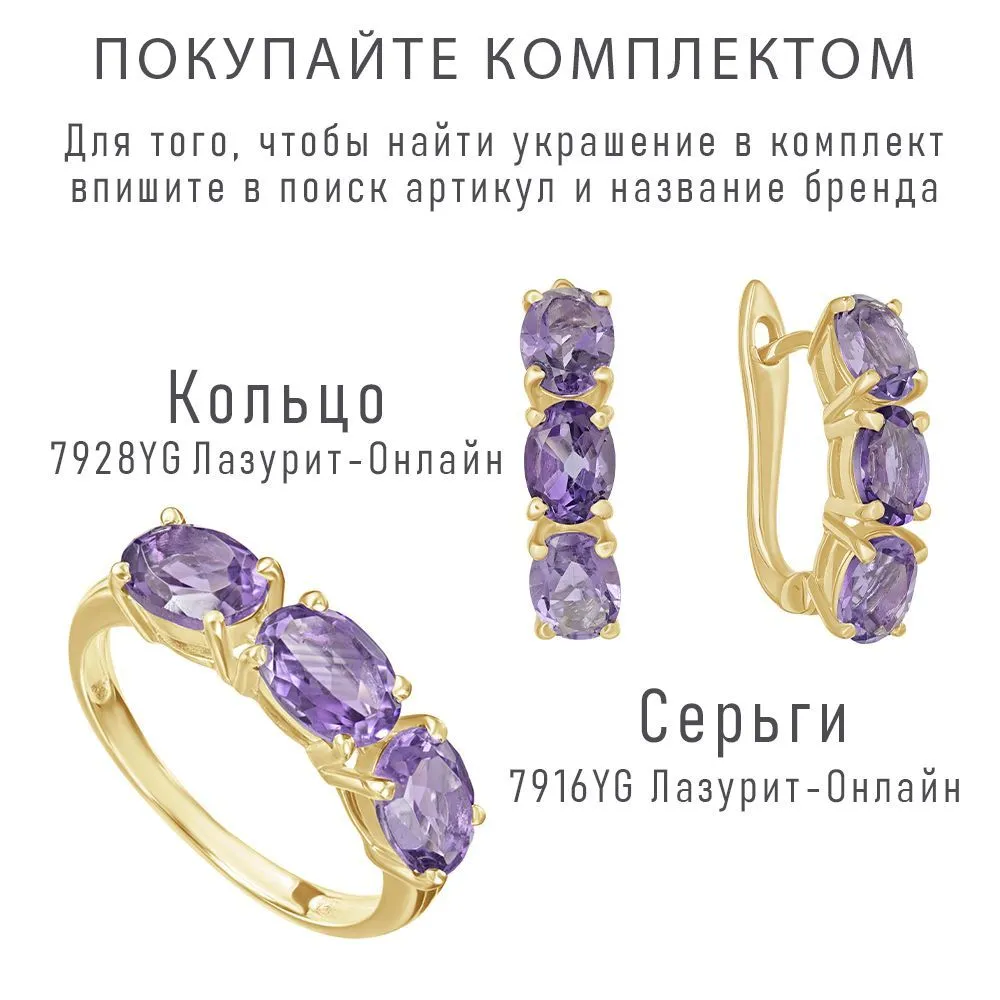 Серебряное кольцо с натуральным аметистом - коллекция Муза. Серебряное кольцо 925 пробы с покрытием желтое золото. Цвет покрытия соответствует швейцарскому цветовому стандарту NIHS -FF24ct и цвету чистого золото 999.99. На последней фотографии мы разместили сравнительную фотографию 3 цвета золотого покрытия. Помимо предания золотого цвета Вашему изделию, тонкий слой золота защищает от окисления. Для более стойкого эффекта золочения и долговечности покрытия мы дополнительно наносим подслой палладия (Pd). Средний вес изделия с камнями 2.55 гр. Месторождение(я): Аметист (Приполярный Урал, Россия). Аметист (Натуральный) овал 5*7 мм., средний вес: 0,81 карат. Размер лицевой части: 5*21 мм. Все изделия собственного производства, гарантия 12 месяцев. Арт. 7928