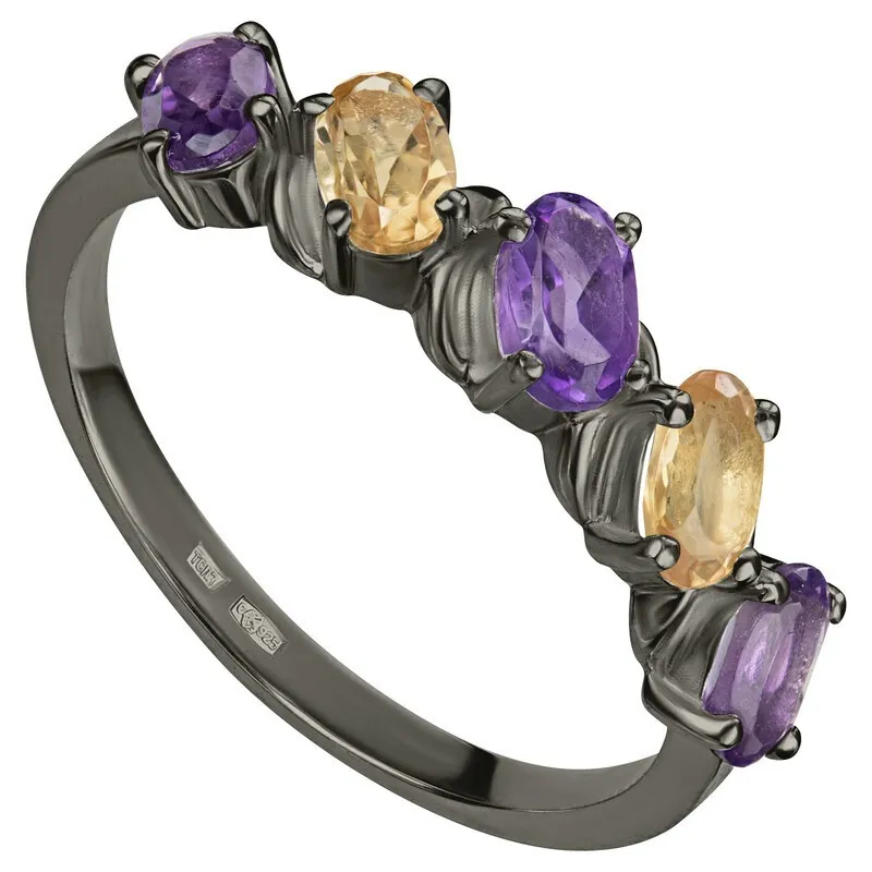 Серебряное кольцо с натуральными камнями аметист и цитрин - коллекция Колосок, покрытие Черный Родий.