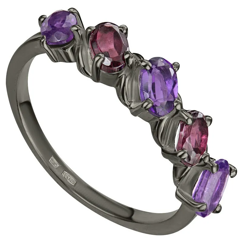Серебряное кольцо с натуральными камнями аметист и гранат - коллекция Колосок, покрытие Черный Родий.
