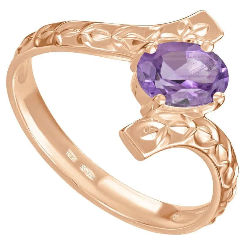 Серебряное кольцо с натуральным аметистом - коллекция Тея. Серебряное кольцо 925 пробы с покрытием красное золото. Цвет покрытия соответствует швейцарскому цветовому стандарту NIHS -5N и цвету красного золота 585 в России. На последней фотографии мы разместили сравнительную фотографию 3 цвета золотого покрытия. Помимо предания золотого цвета Вашему изделию, тонкий слой золота защищает от окисления. Для более стойкого эффекта золочения и долговечности покрытия мы дополнительно наносим подслой палладия (Pd). Средний вес изделия с камнями 2.41 гр. Месторождение: Аметист (Приполярный Урал, Россия) Аметист (Натуральный) овал 5*7 мм., средний вес: 0.83 карат. Все изделия собственного производства, гарантия 12 месяцев. Арт. 8098