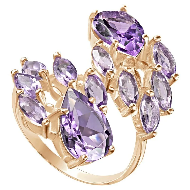 Серебряное кольцо с натуральным аметистом - коллекция Зарница. Серебряное кольцо 925 пробы с покрытием розовое золото. Цвет покрытия соответствует швейцарскому цветовому стандарту NIHS -4N и цвету розового золота 585 в России. На последней фотографии мы разместили сравнительную фотографию 3 цвета золотого покрытия. Помимо предания золотого цвета Вашему изделию, тонкий слой золота защищает от окисления. Для более стойкого эффекта золочения и долговечности покрытия мы дополнительно наносим подслой палладия (Pd). Средний вес изделия с камнями 4.85 гр. Месторождение: Аметист (Приполярный Урал, Россия). Аметист (Натуральный) груша 7*10 мм., средний вес: 1.77 карат. Все изделия собственного производства, гарантия 12 месяцев. Арт. 8364. Аметист — прозрачный или полупрозрачный камень фиолетовых оттенков, подвид кварца. Он гармонизирует разум, снимает стресс, улучшает кровообращение, способствует умственному развитию и личностному росту. Считается, что он также оберегает от головной боли и бессонницы, служит противоядием, помогает избавиться от алкоголизма и наделяет владельца проницательностью, раскрывая «третий глаз» (за который отвечает чакра аджна). В медитации помогает расслабиться и успокоиться. Положенный под подушку, аметист приносит хорошие сны.